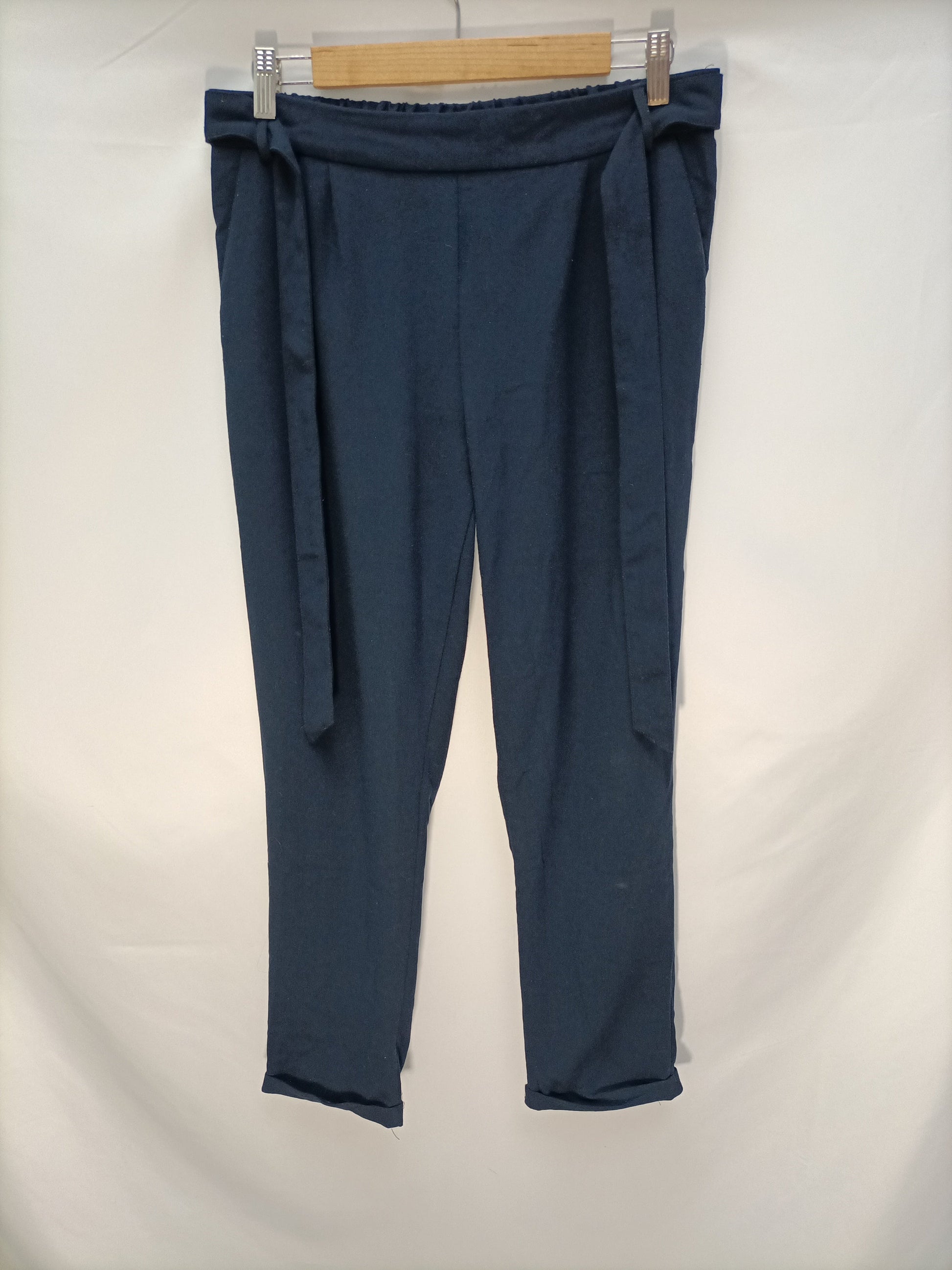 Thin, flowing navy blue trousers with an elastic waistband. A tie belt detail. 96 cm long .