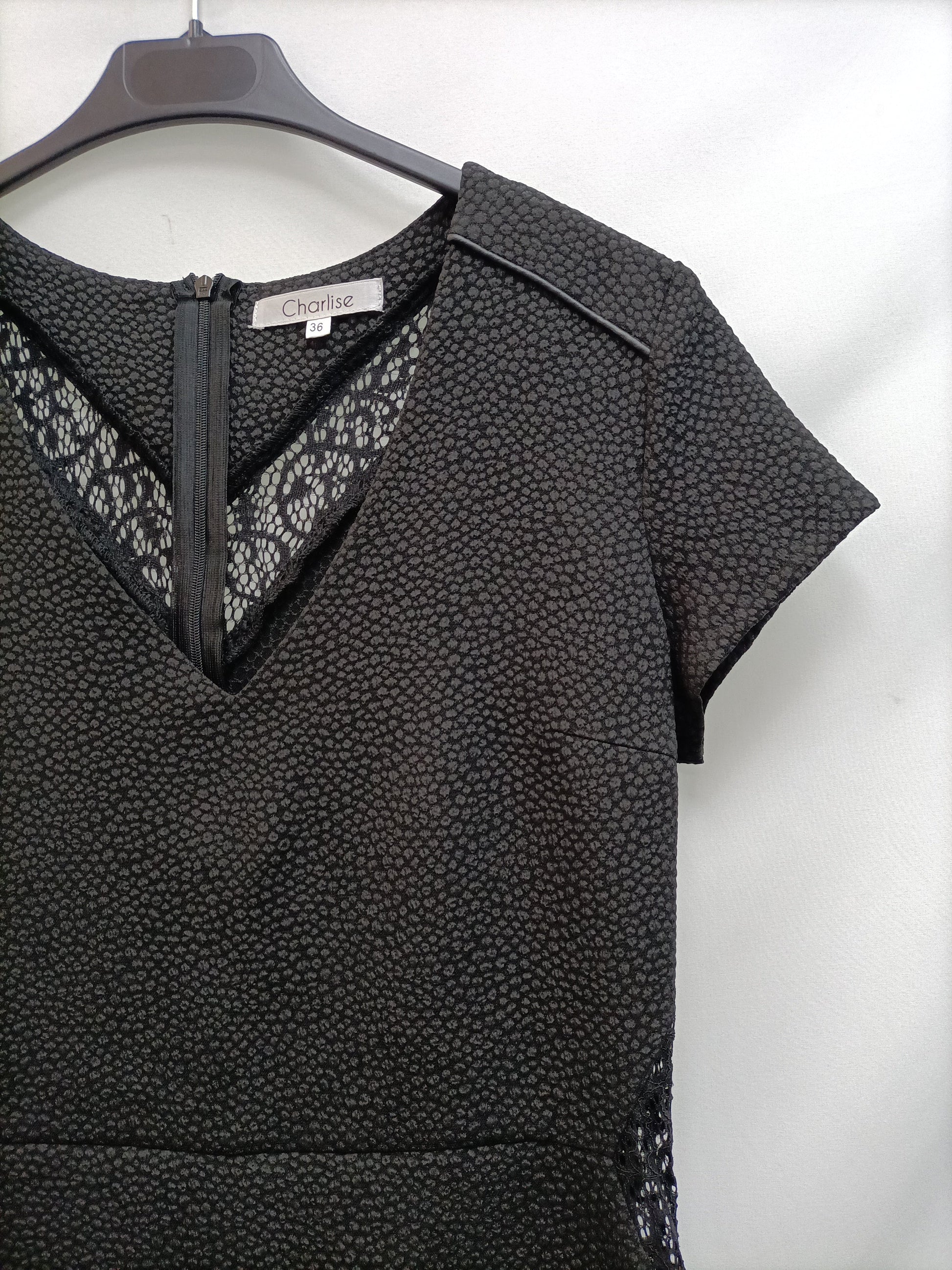 Short black textured dress with lace details. 42cm from armhole to armhole, 83cm long.