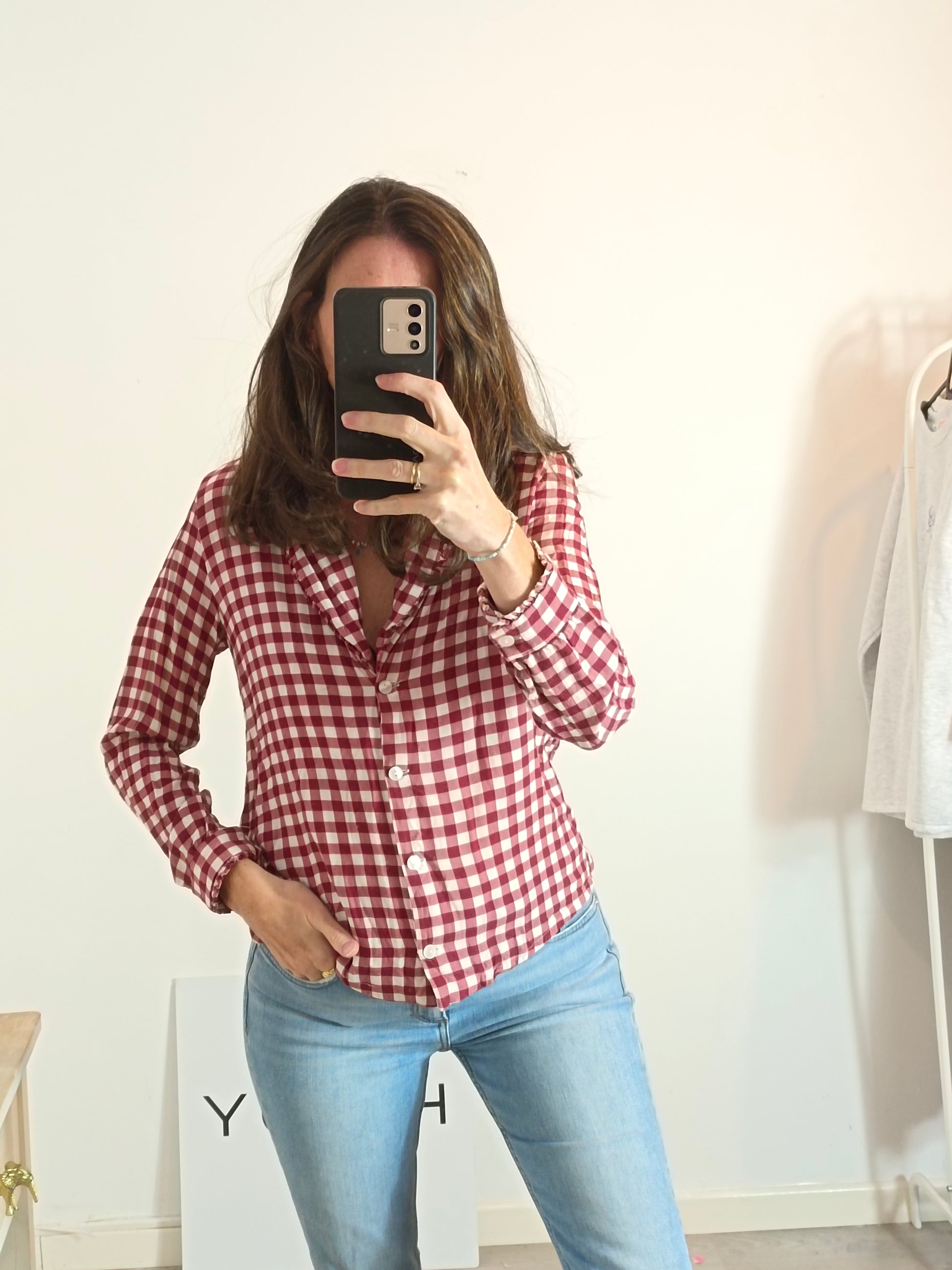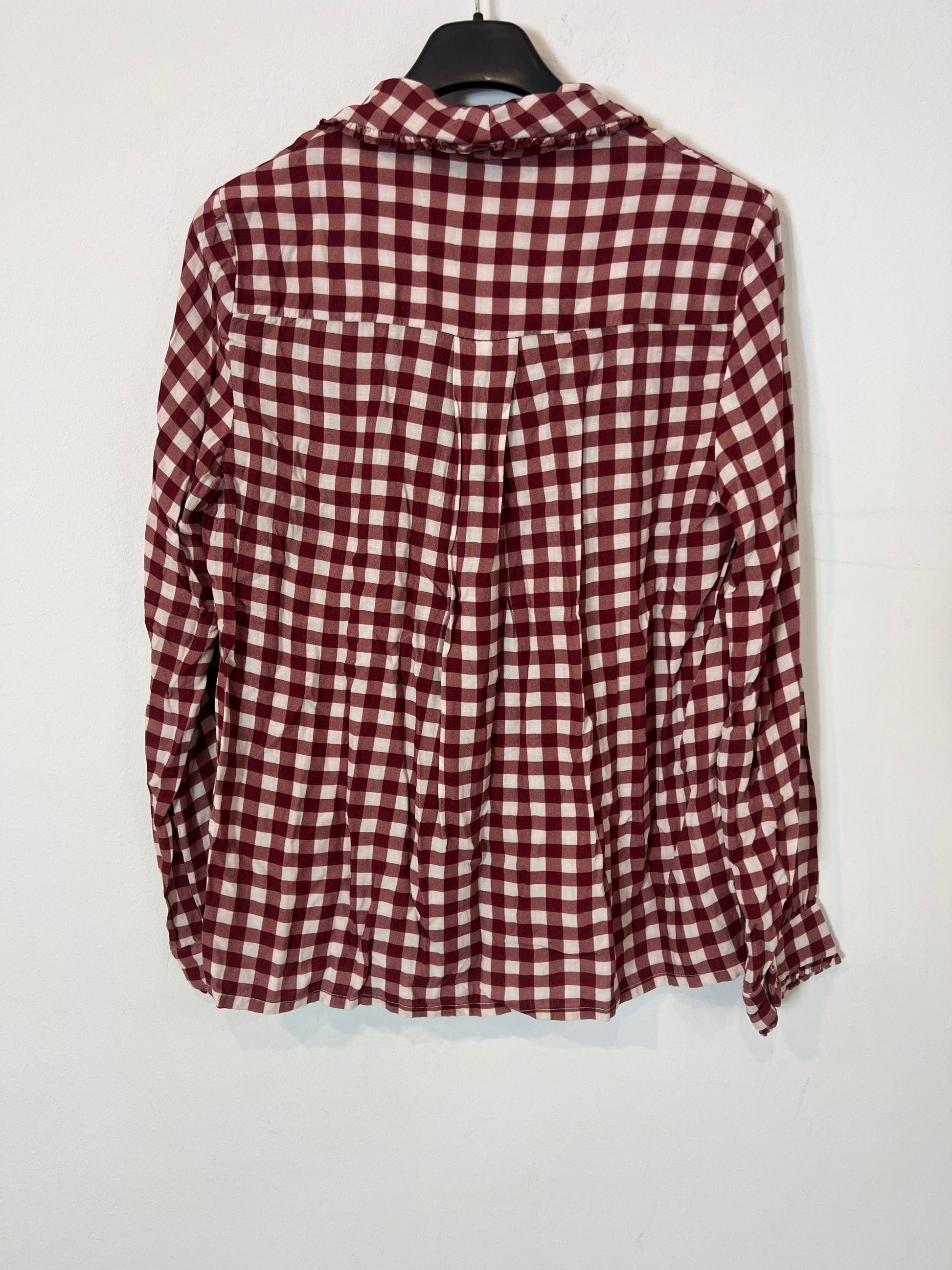 Flowy burgundy and white checked blouse. Back 45cm, length 59cm