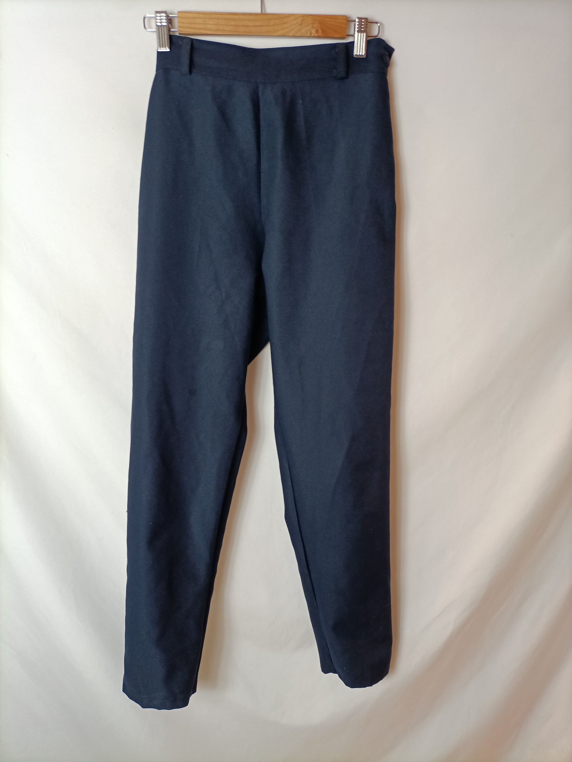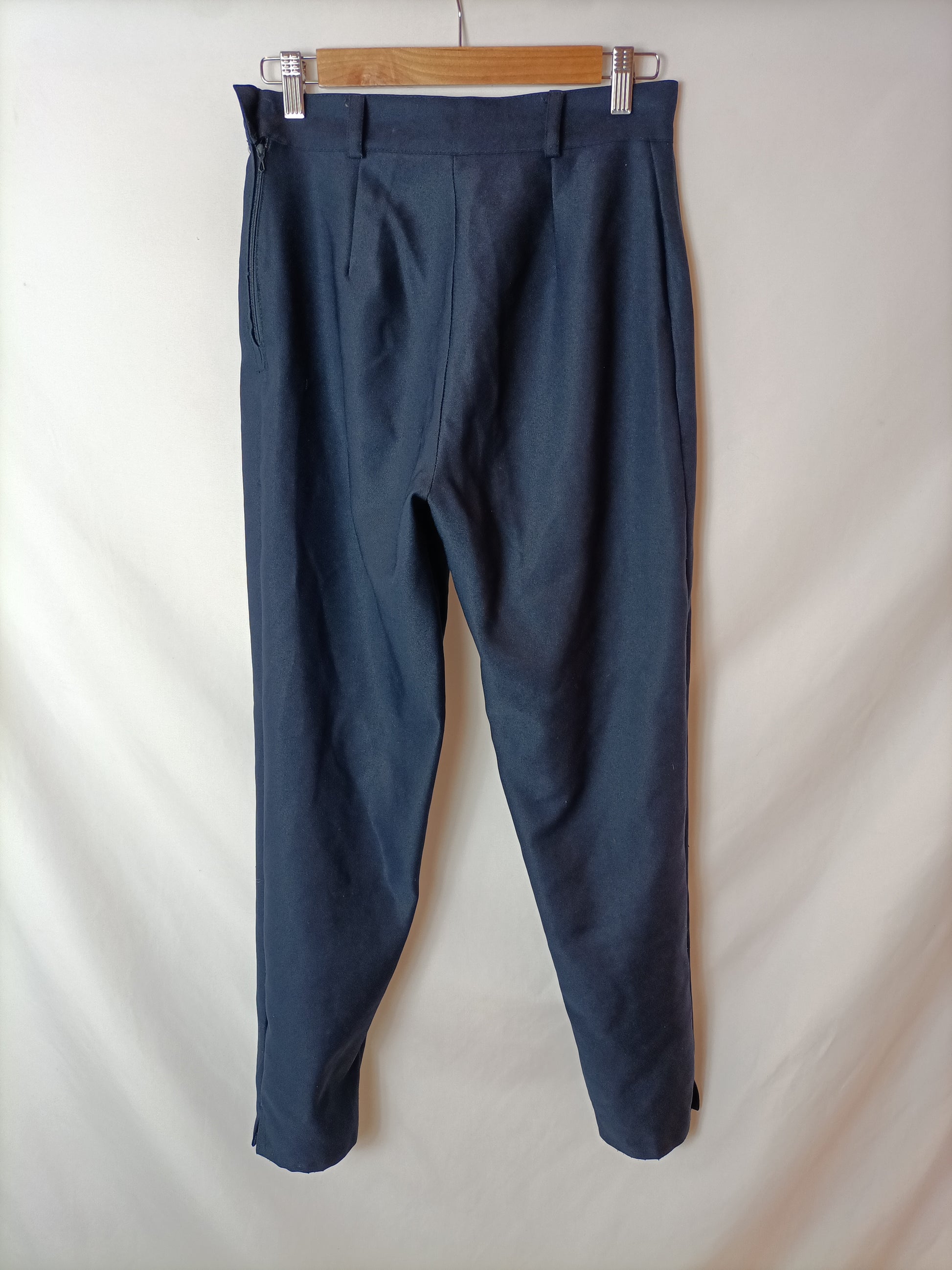 Blue dress-style pants. Side zipper. Non-elastic. Mini slit at the bottom. Waist 15.5 inches (38 cm) and length 40.1 inches (102 cm).