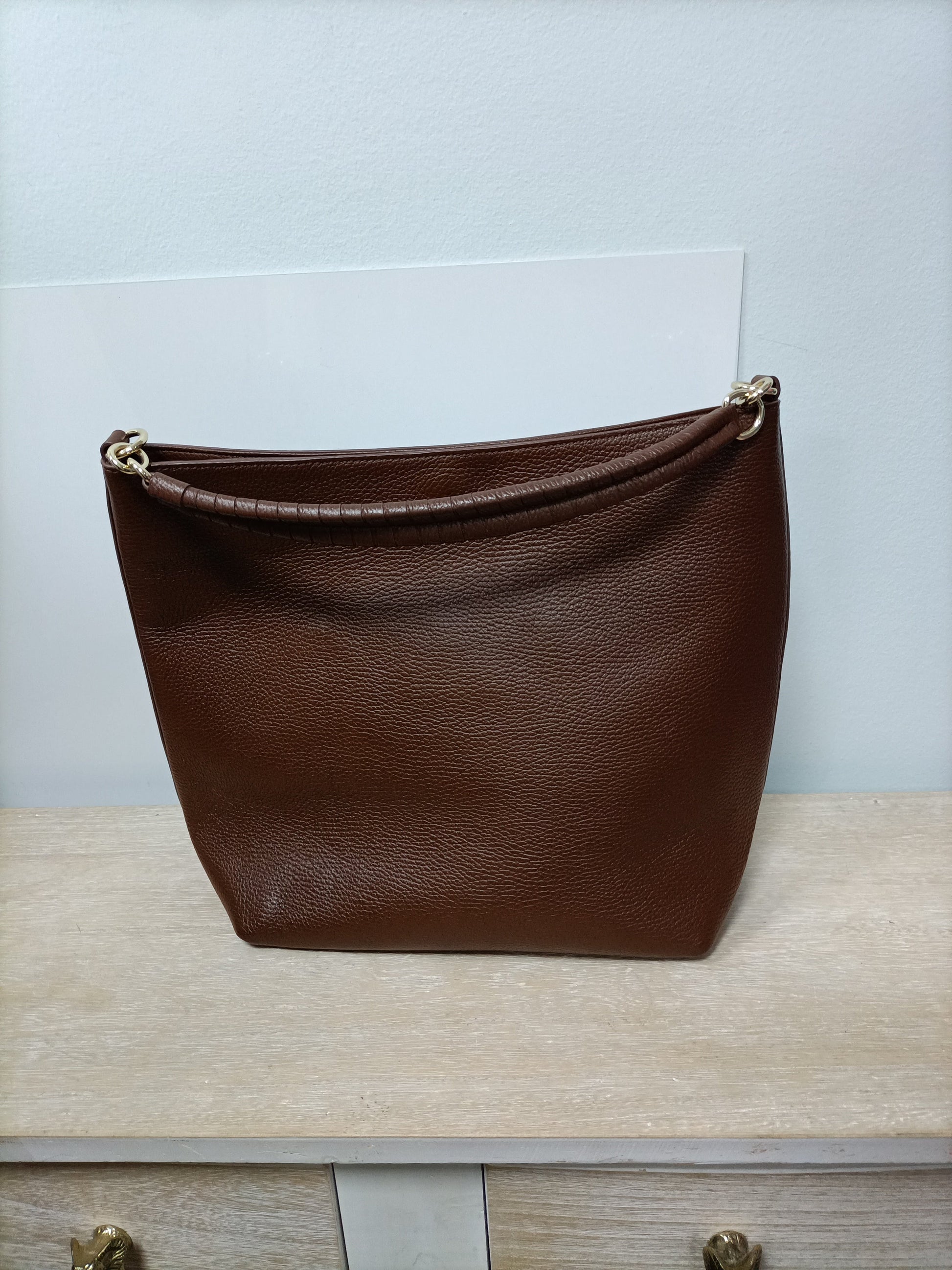 Brown leather bag. Short handle.