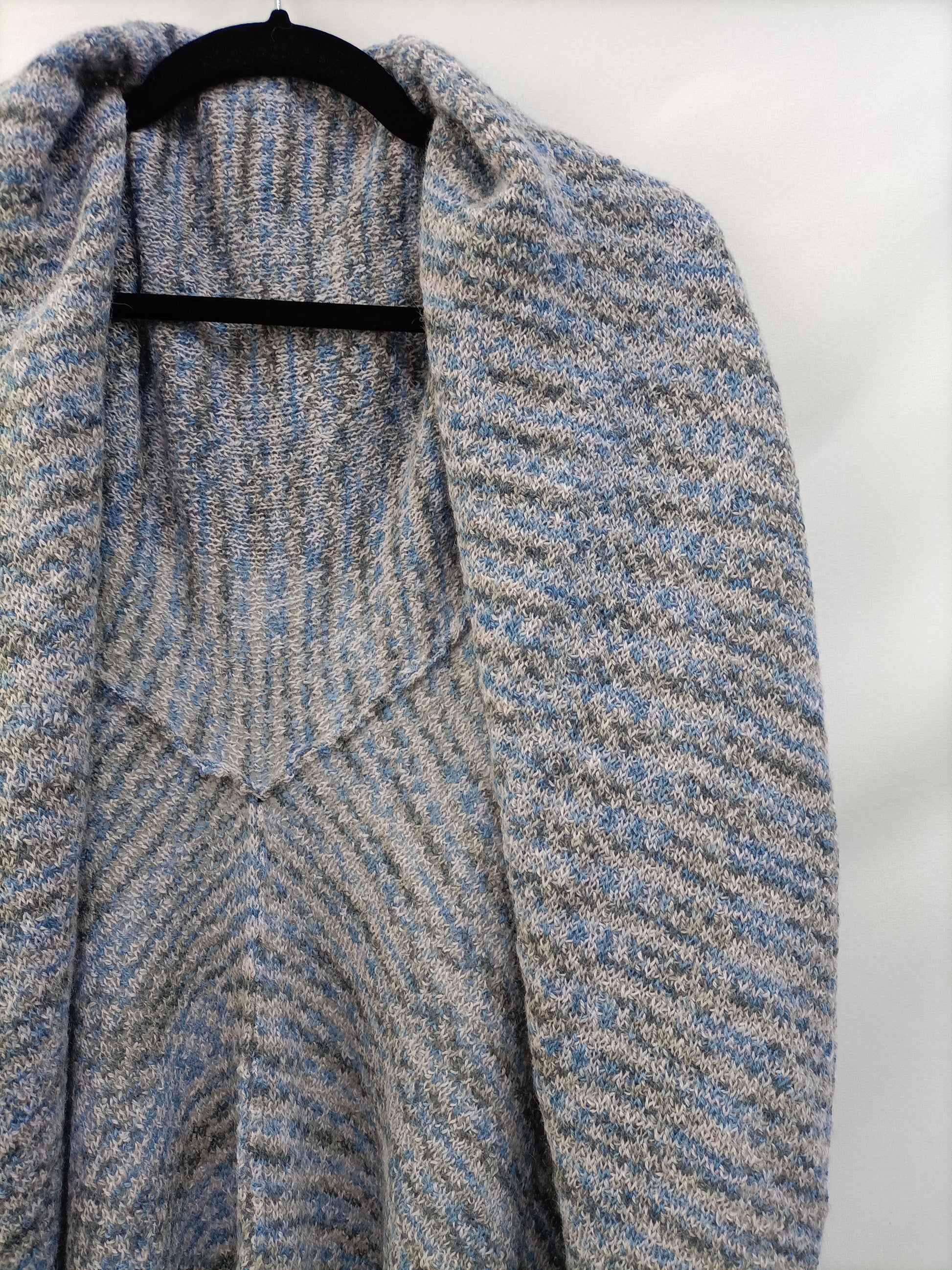 Sleeveless cardigan-style vest with lapels. It doesn't button up. It has a hole in the neck.