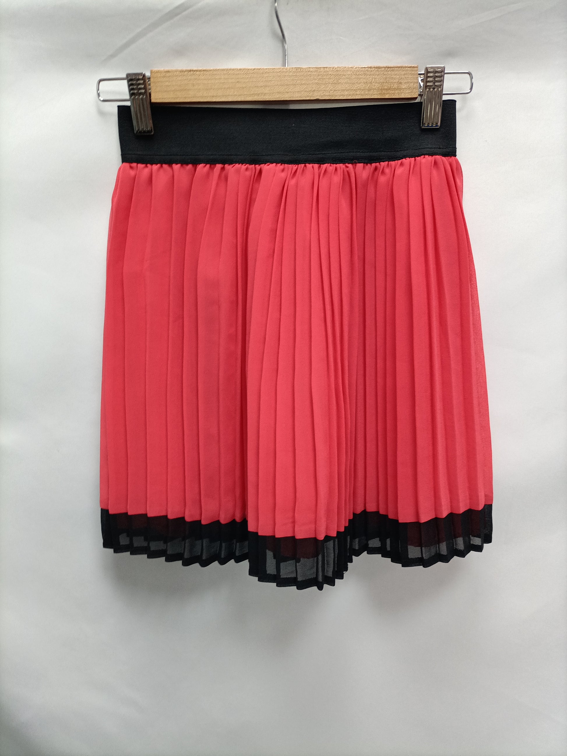 Flowing coral and black pleated short skirt. Elastic waist. 41 cm long.