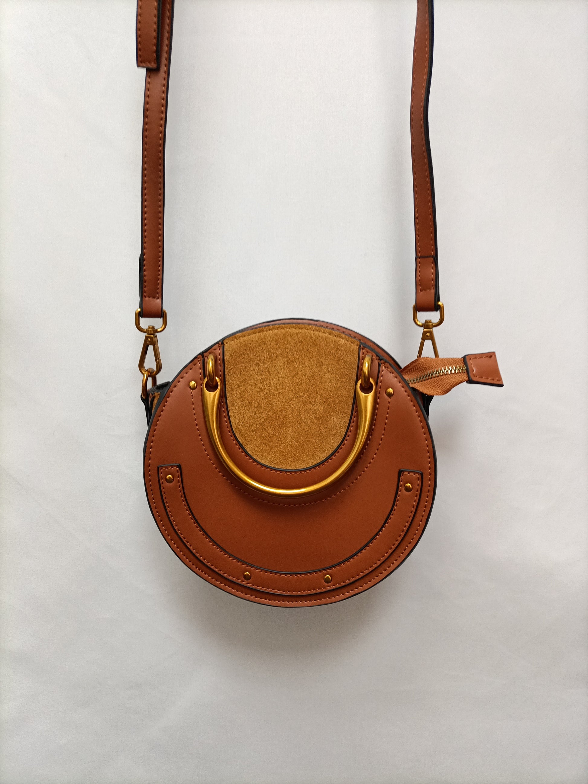 Camel and mustard round bag with mustard suede details. Removable long handle. 21 x 8 cm.