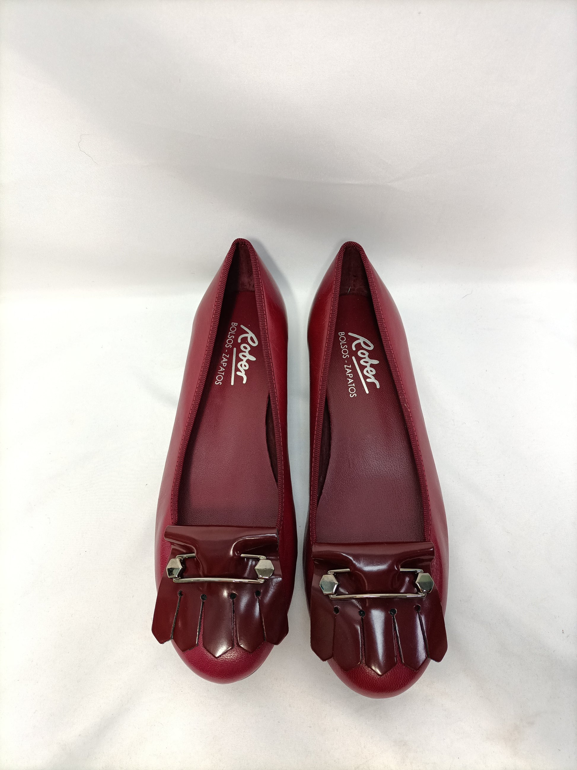 Burgundy leather ballerina flat with a flap and silver buckle. Slight internal heel. 4 cm heel.