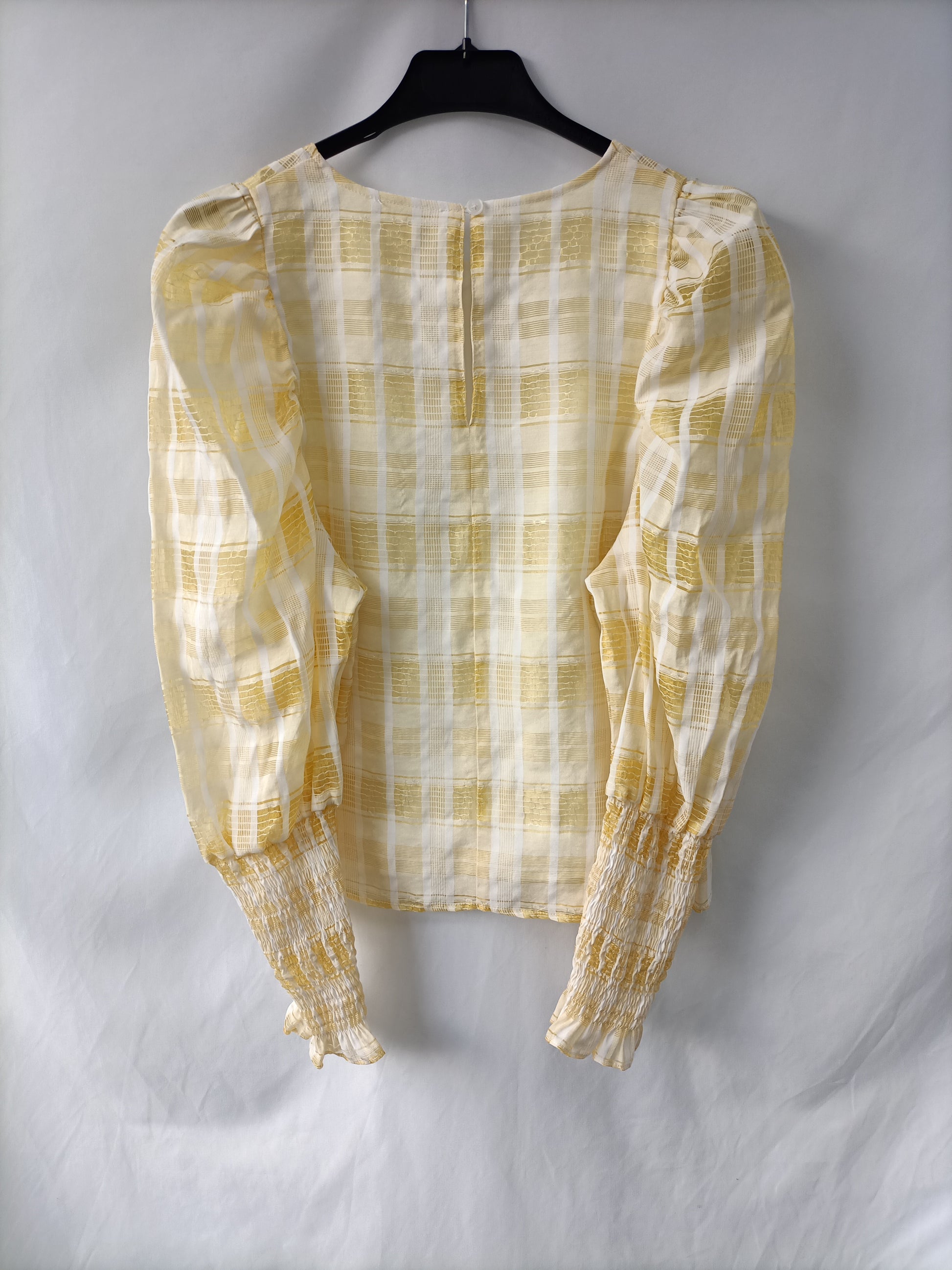 White and yellow checked blouse with puffed sleeves. 42 cm from armhole to armhole. 51 cm long.