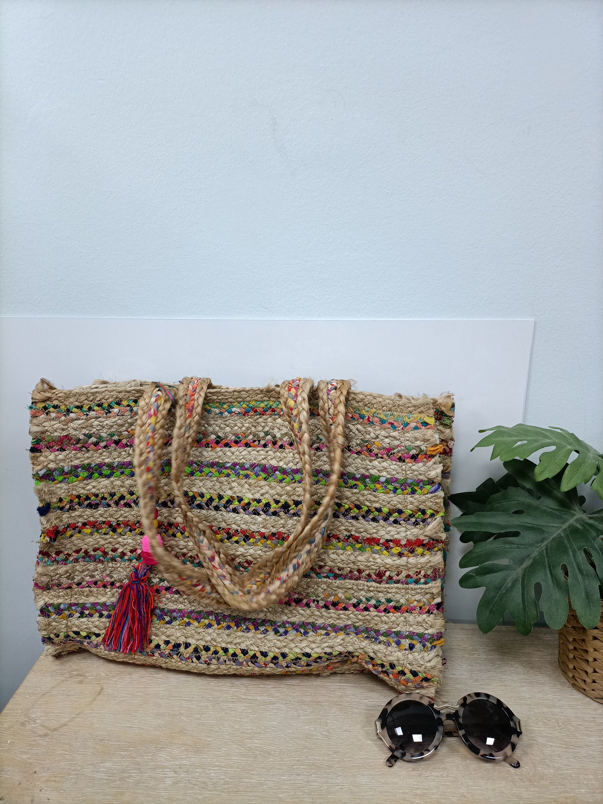 Raffia bag with colorful stripes. Zipper closure. 48x8x18 cm.