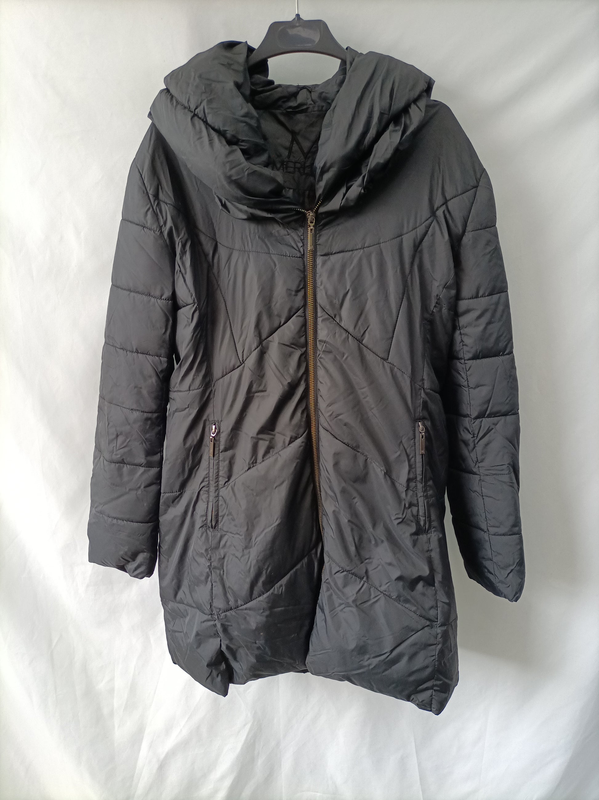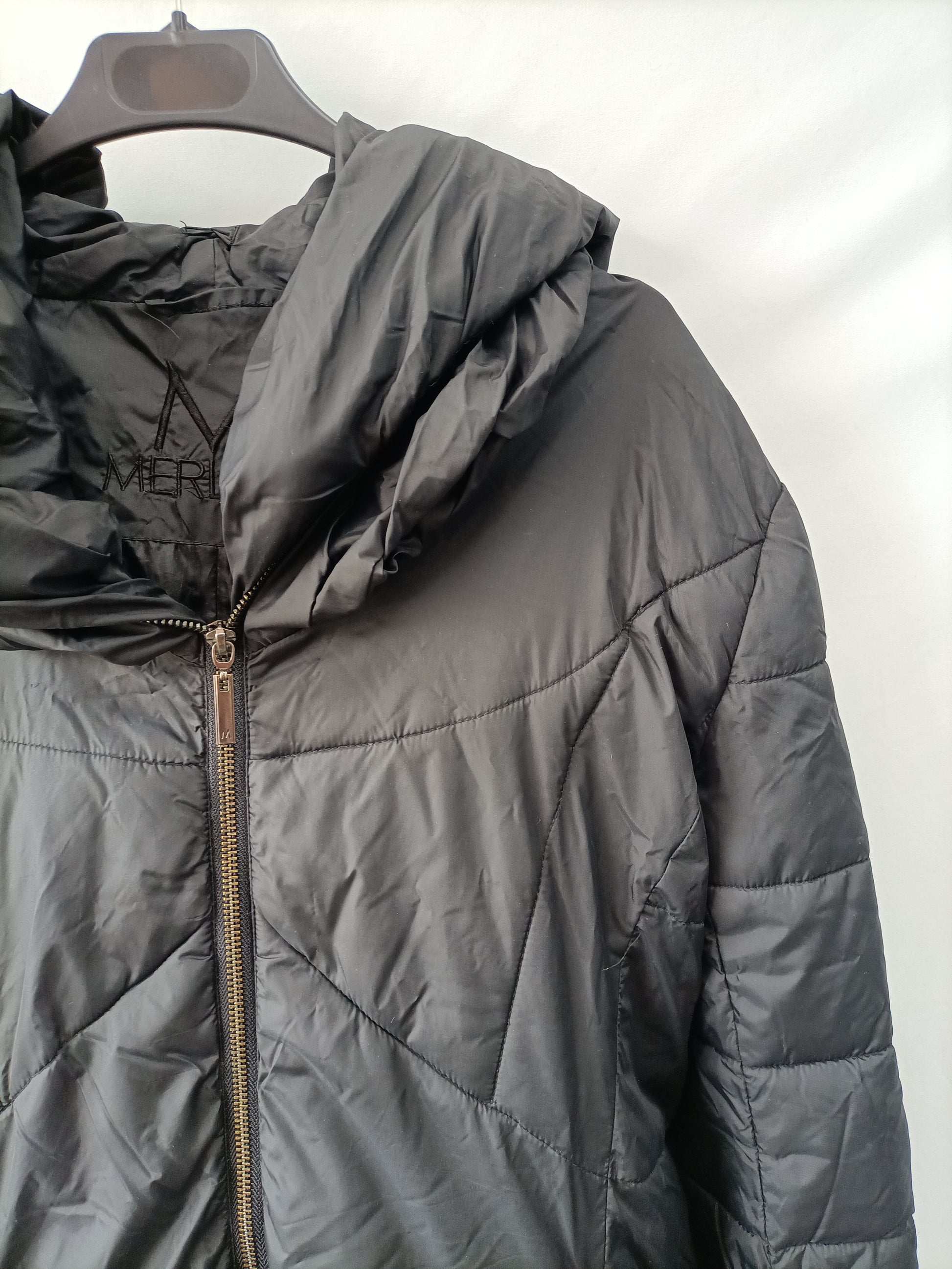 Knee-length black down jacket with a wide collar. Lightweight and not heavy. Armpit to armpit 50 cm, length 85 cm.