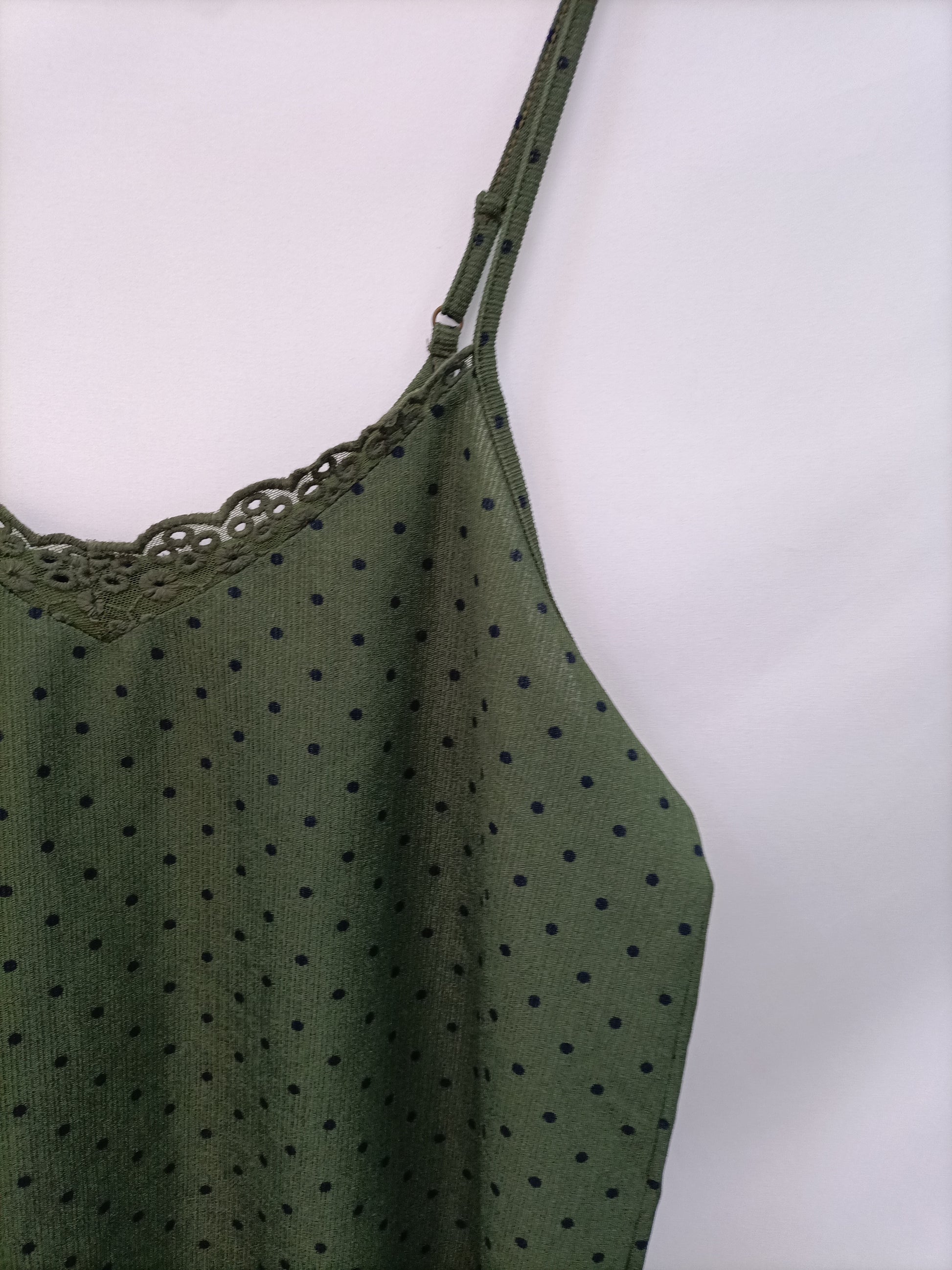 Green stretch lingerie-style top with blue polka dots. Elastic. Length 69 cm.