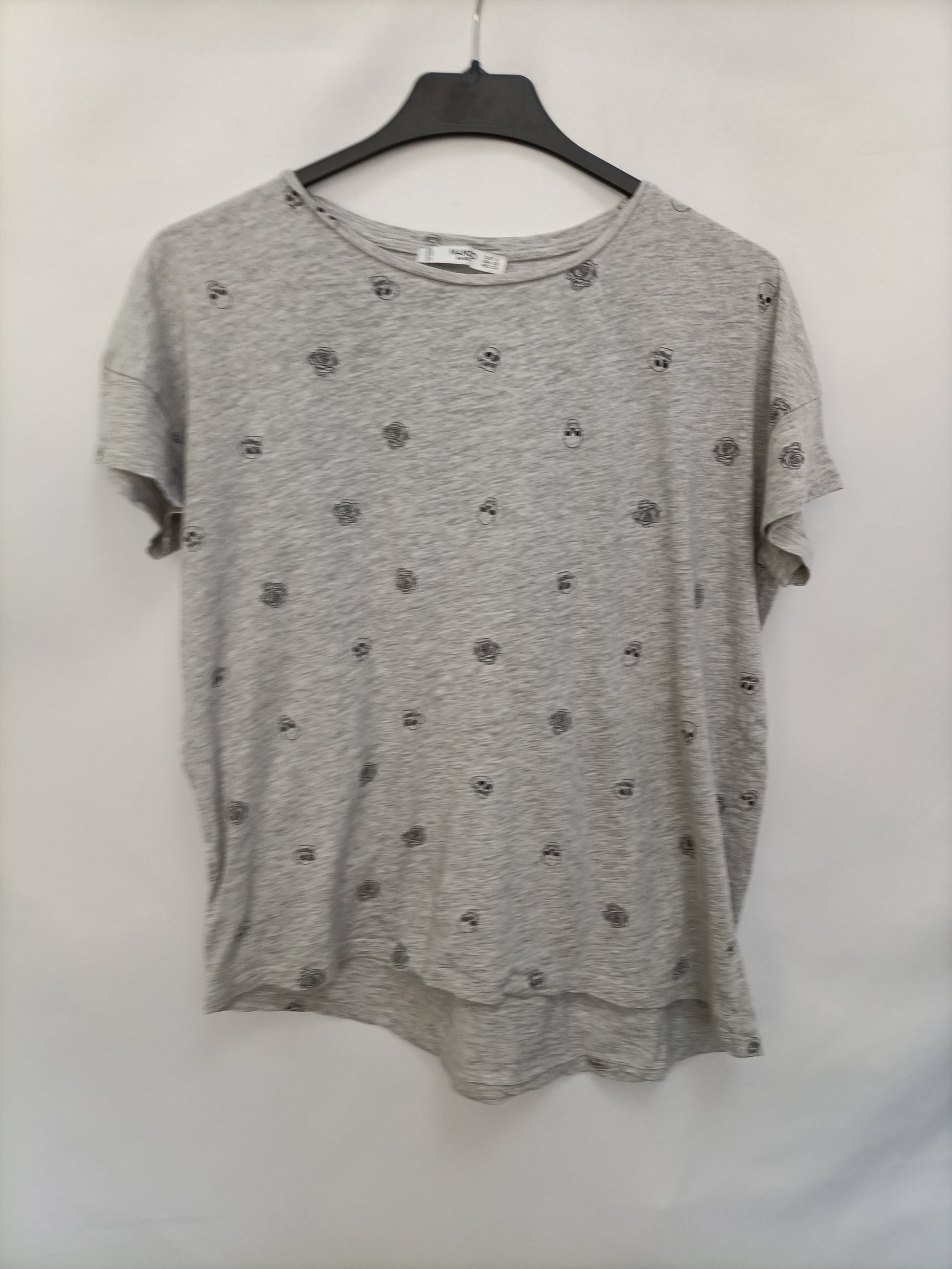 Gray flowy T-shirt with a black rose and skull print. Elastic. 56 cm long.