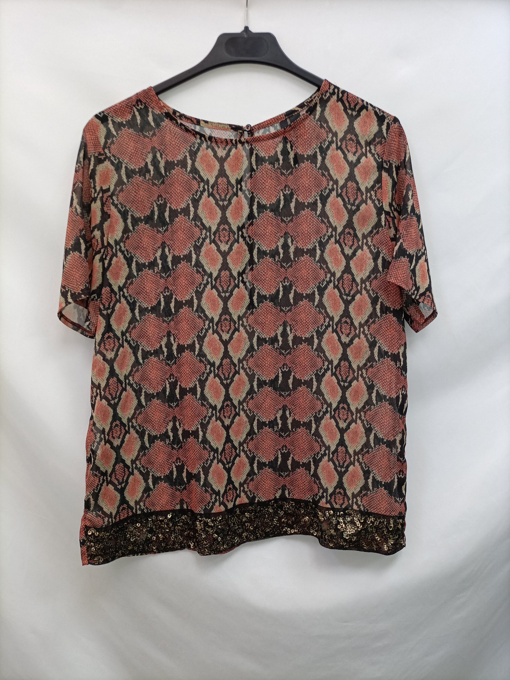 Black and tile print blouse. Semi-sheer. From armpit to armpit 48 cm. Length 59 cm.