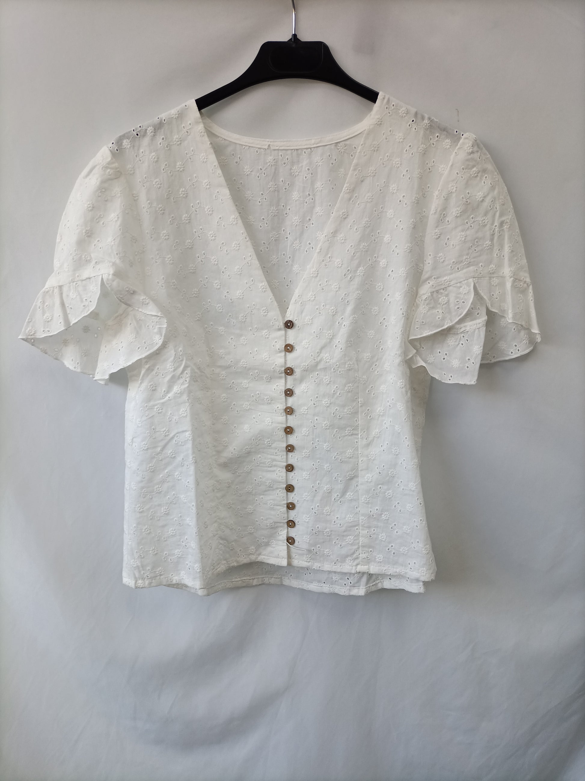White die-cut blouse. Non-stretch. 10% cotton. Armhole to armhole 34 cm, length 53 cm.