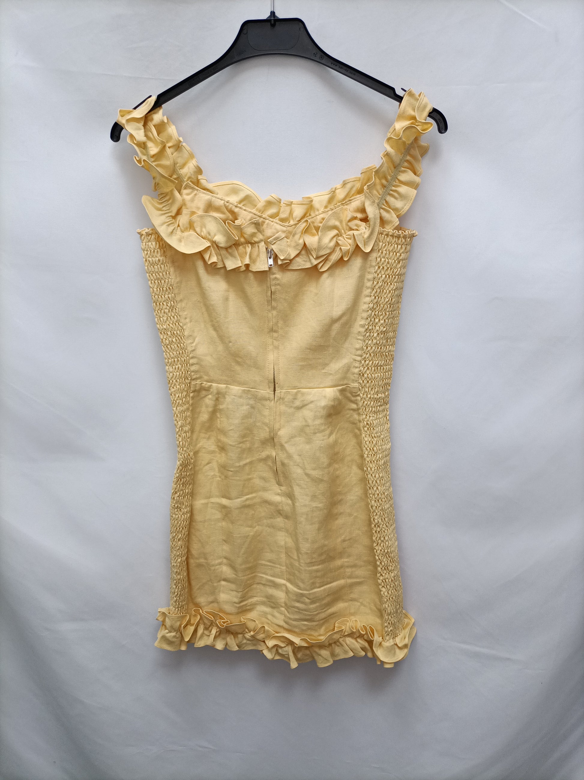 Short linen dress with ruffles. Elastic honeycomb detailing on the sides. 38 cm from armhole to armhole, 79 cm long.