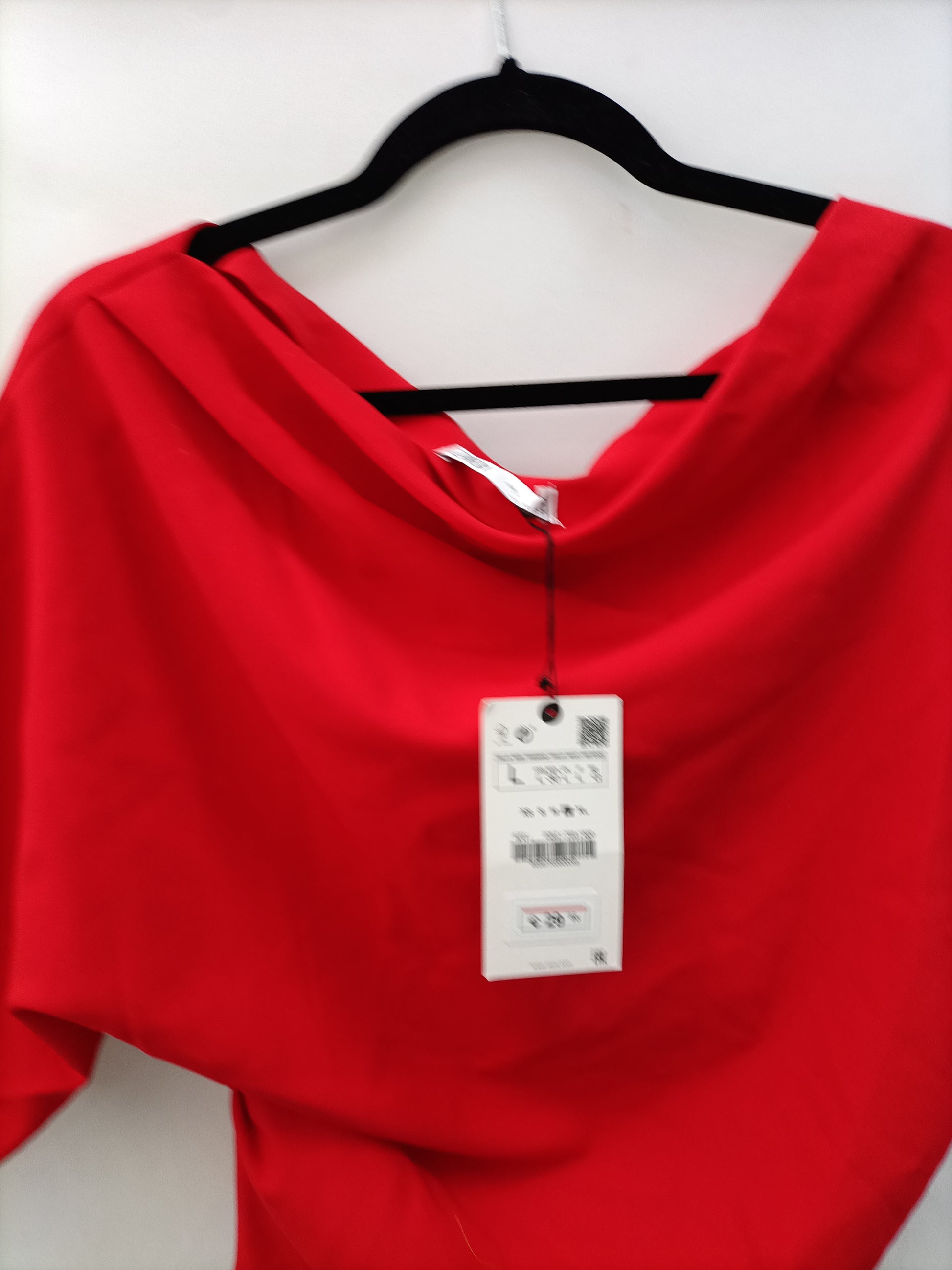NEW WITH TAG. Gathered red top with asymmetrical sleeves. Length 48 cm.