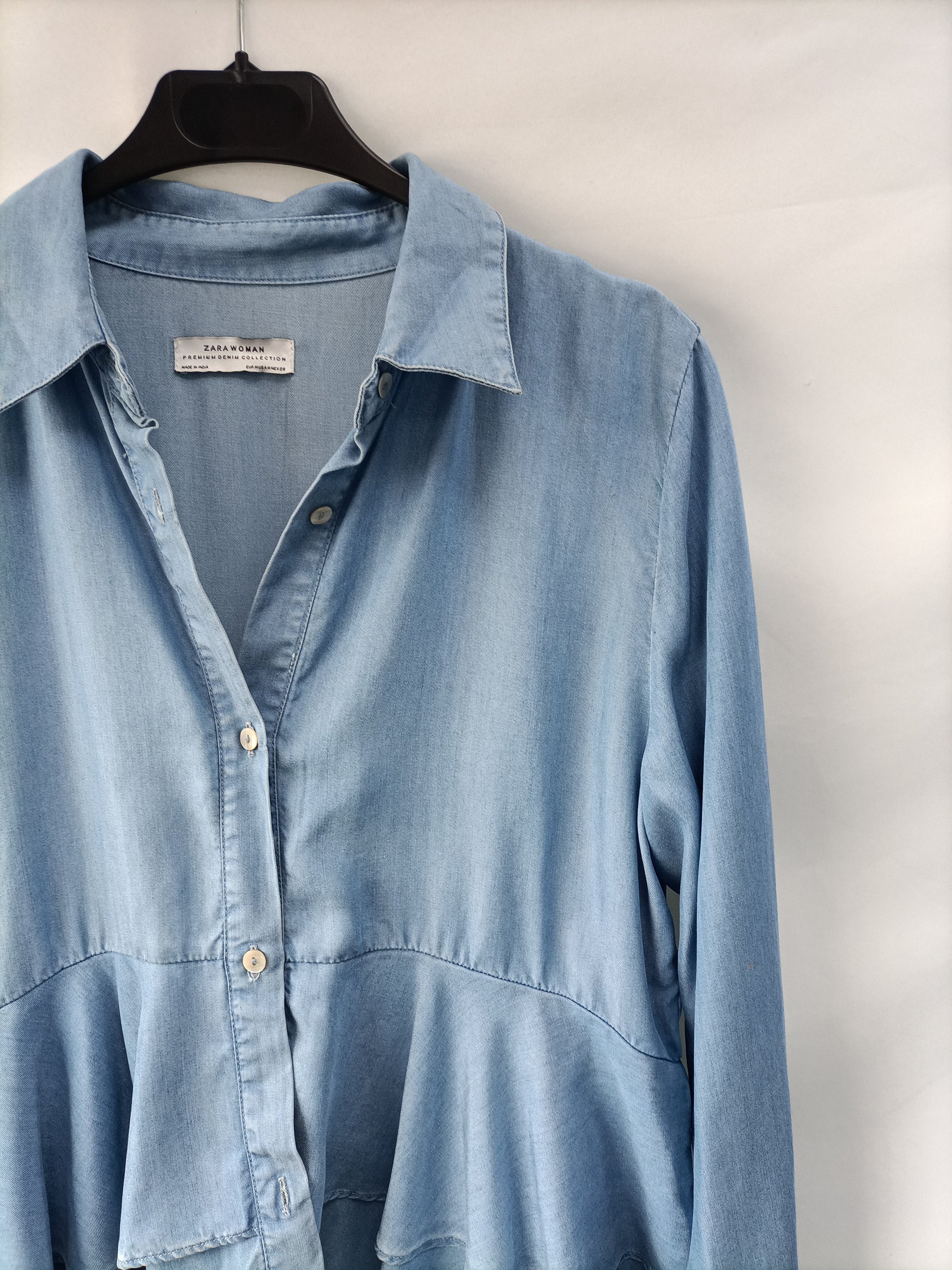 Fine denim blouse with an asymmetrical ruffle at the bottom. Non-stretchy. 50 cm from armhole to armhole, 103 cm long.
