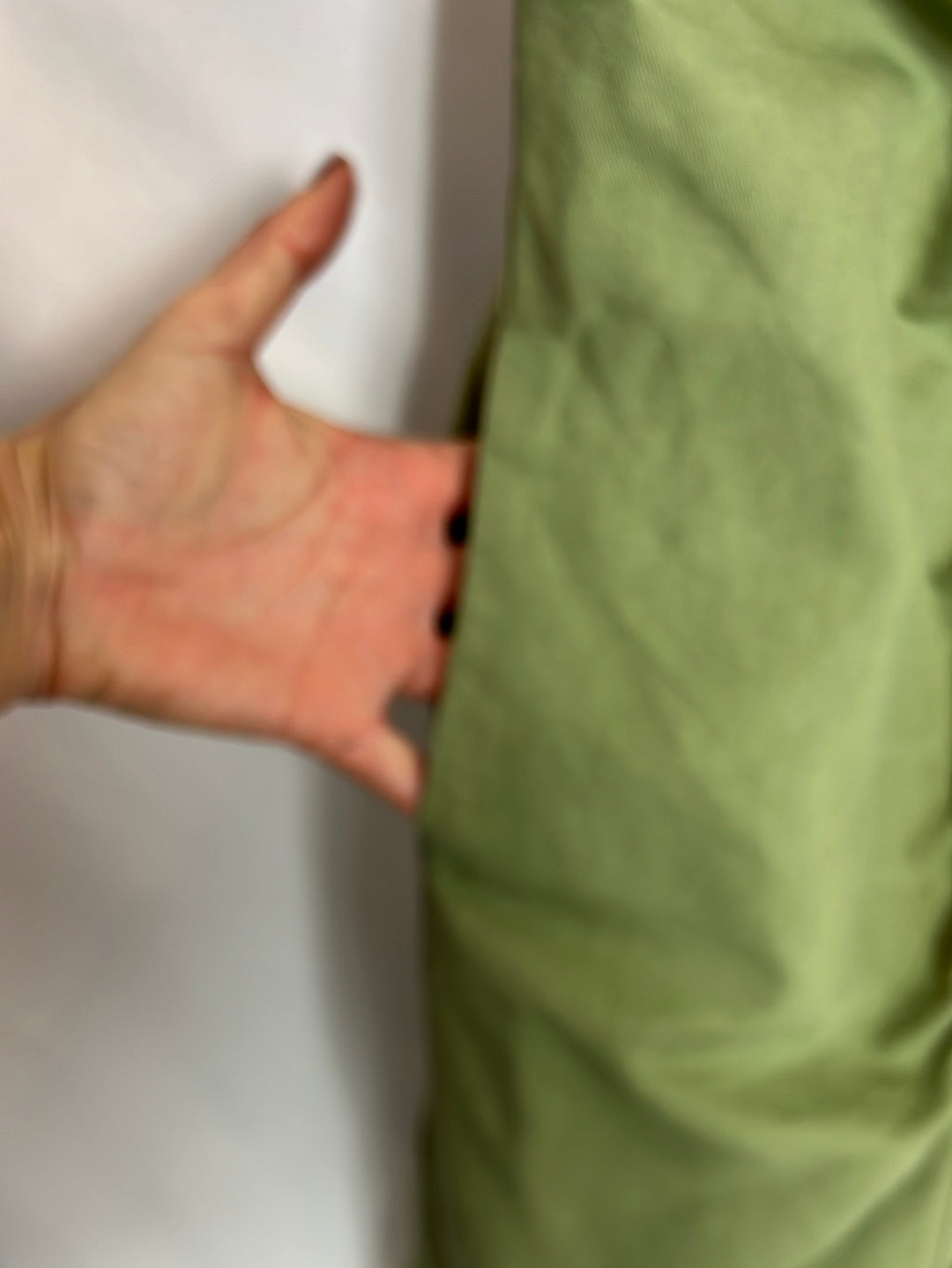 Green buttoned dress with gathered detail. 40cm from armhole to armhole, 100cm long, non-elastic.