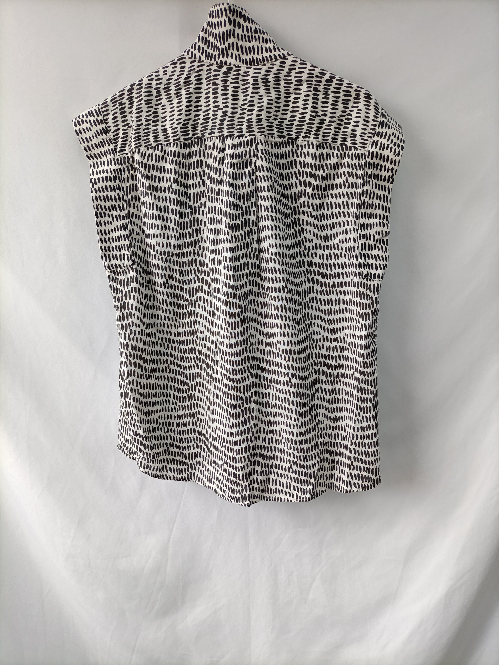 Flowy blouse with a black and white print in linen. Buttoned. Length 66 cm.