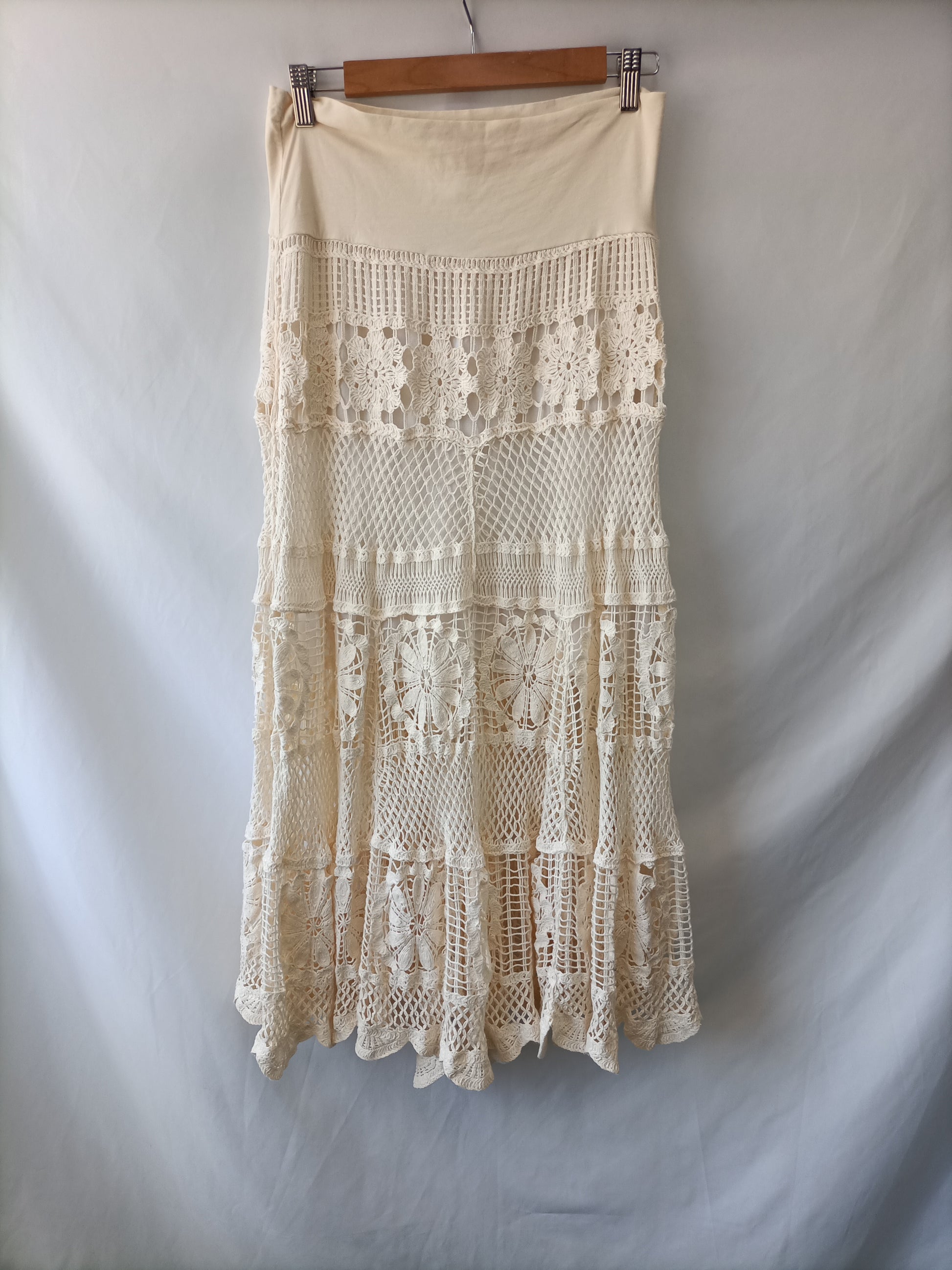 Long beige crochet skirt. Short inner lining. Elastic waist. Length 94 cm.