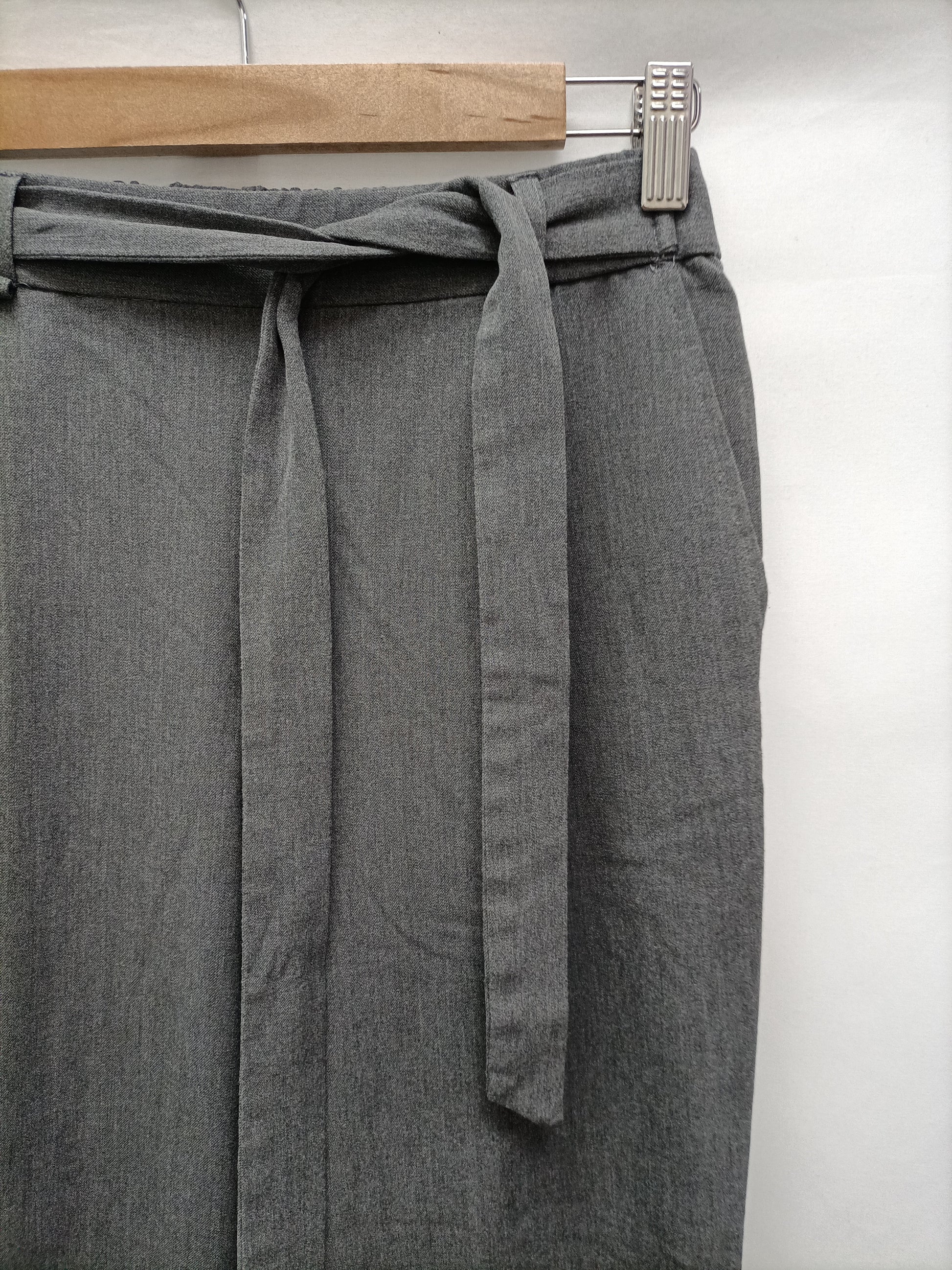 Flowy charcoal gray trousers with an elastic waistband and tie detail. 35.5 inches long.