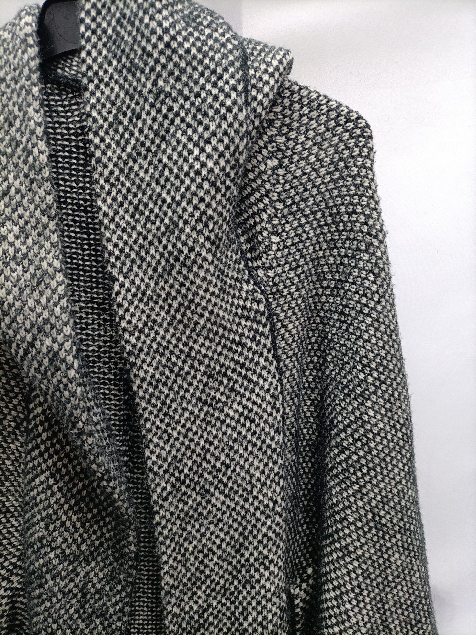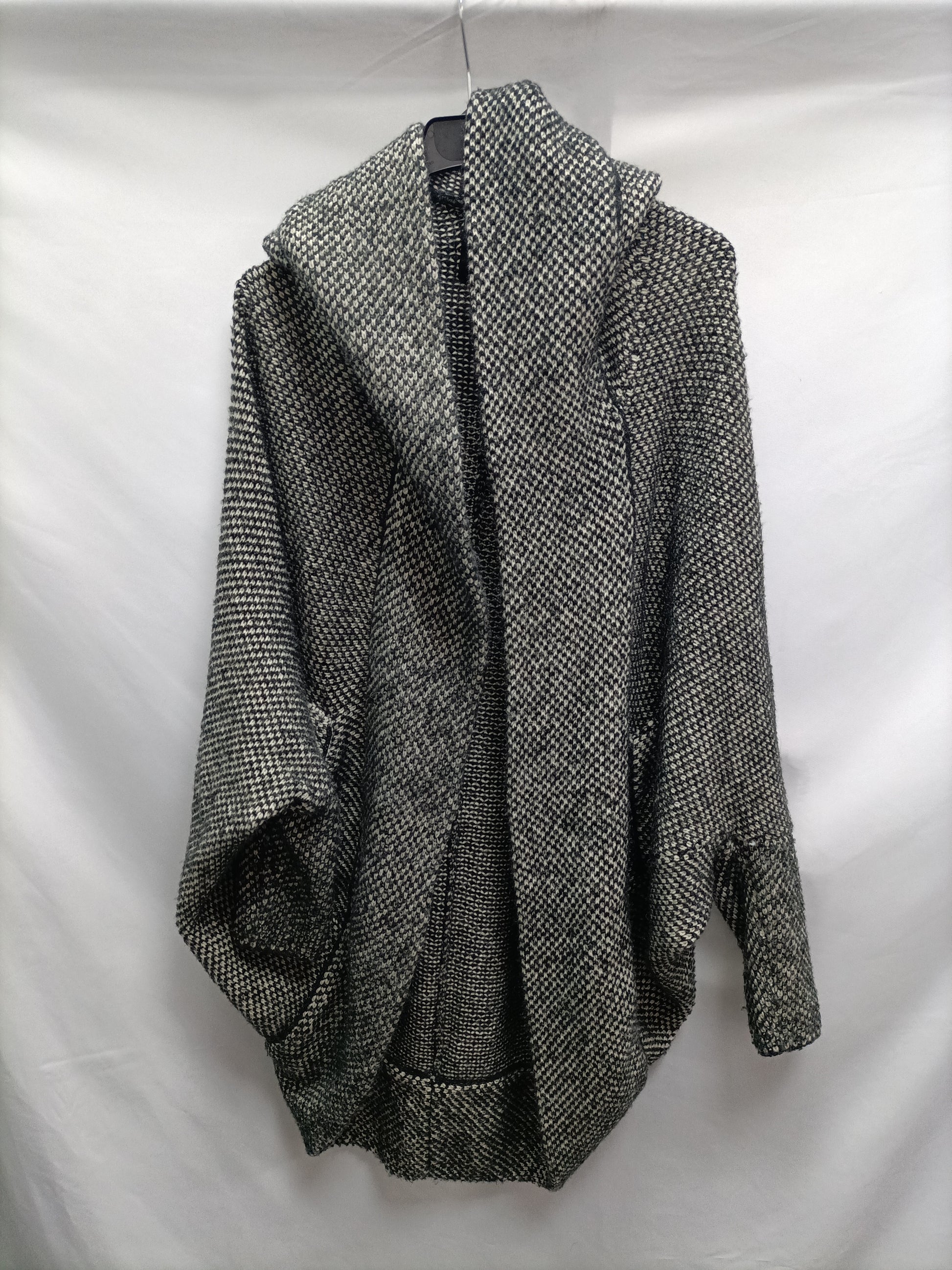 Gray and white flecked cardigan with batwing sleeves. It features a hood and doesn't fasten. Elastic waistband. 93 cm long.