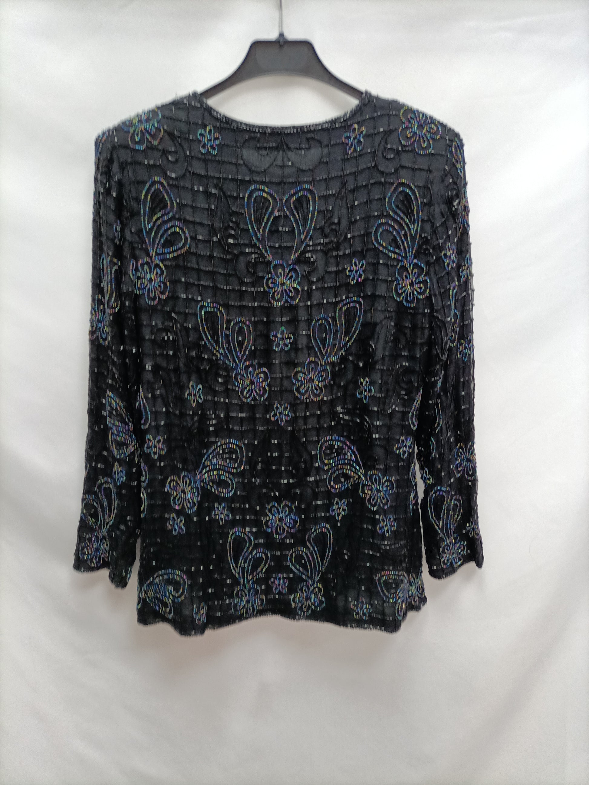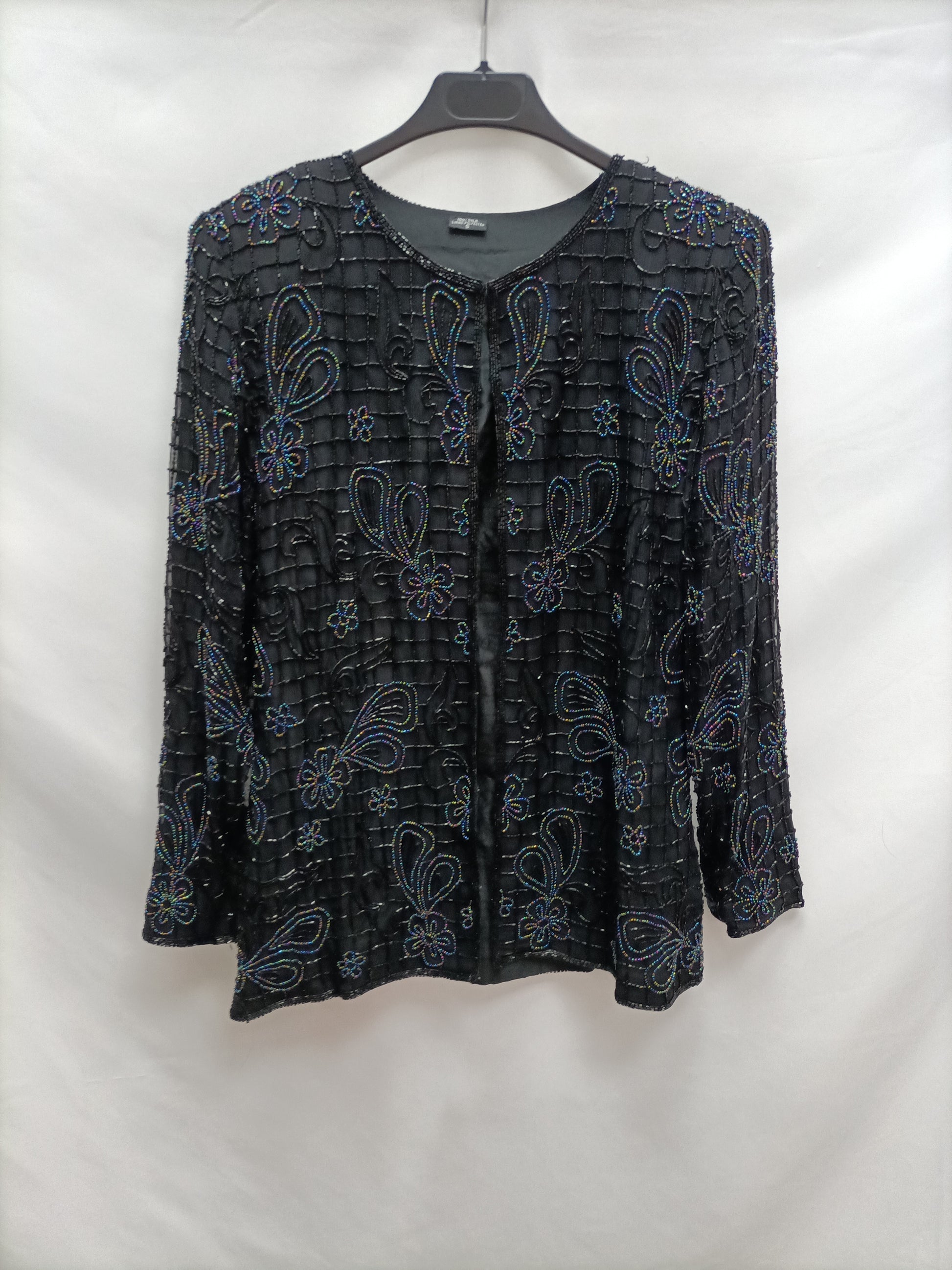 A fine silk jacket with beads. Flowy and vintage. It's stretchy. 50 cm from armhole to armhole and 67 cm long.