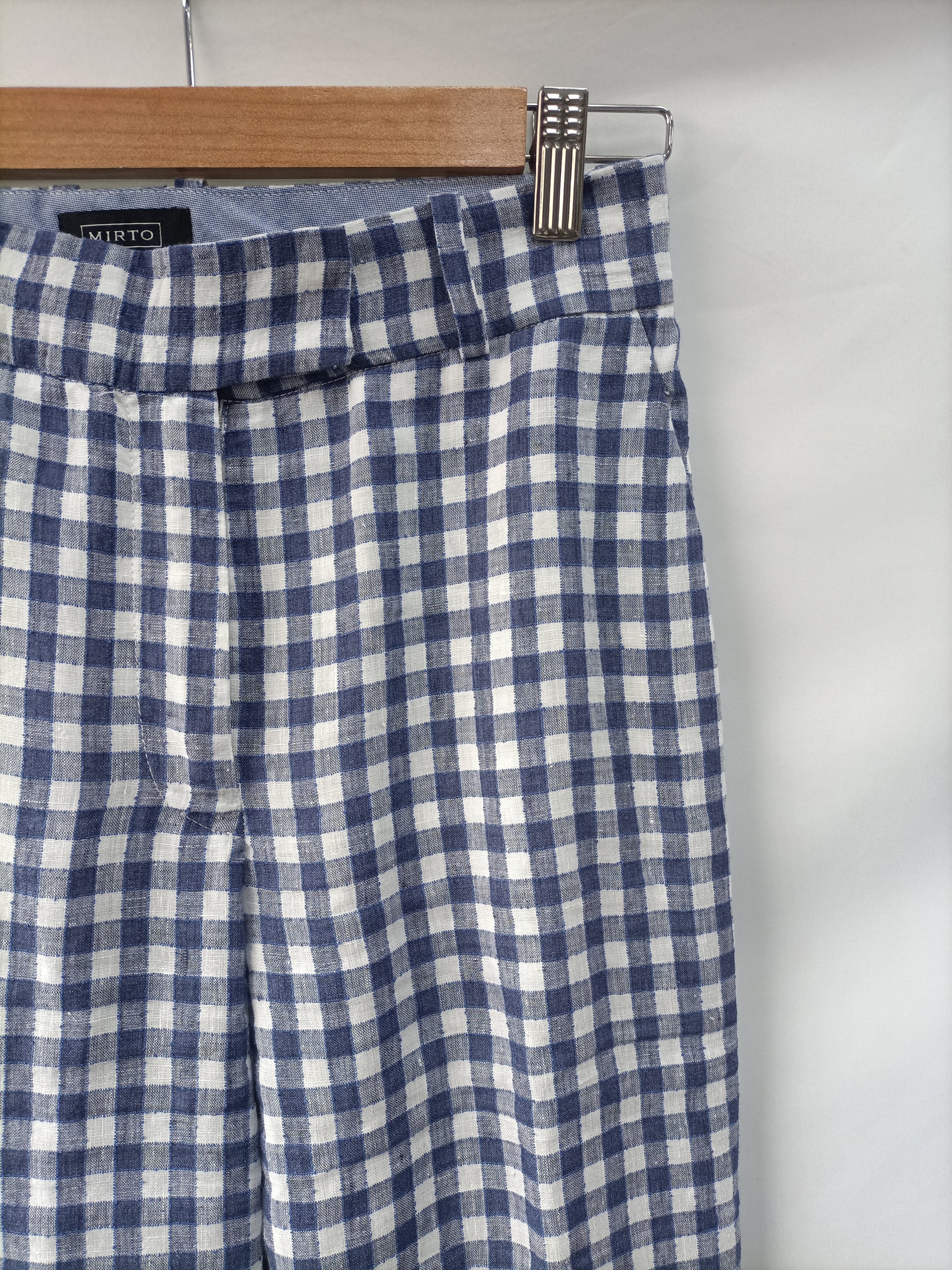 Blue and white gingham linen trousers. Flowy. Non-stretchy. Waist 36 cm. Length 100 cm.