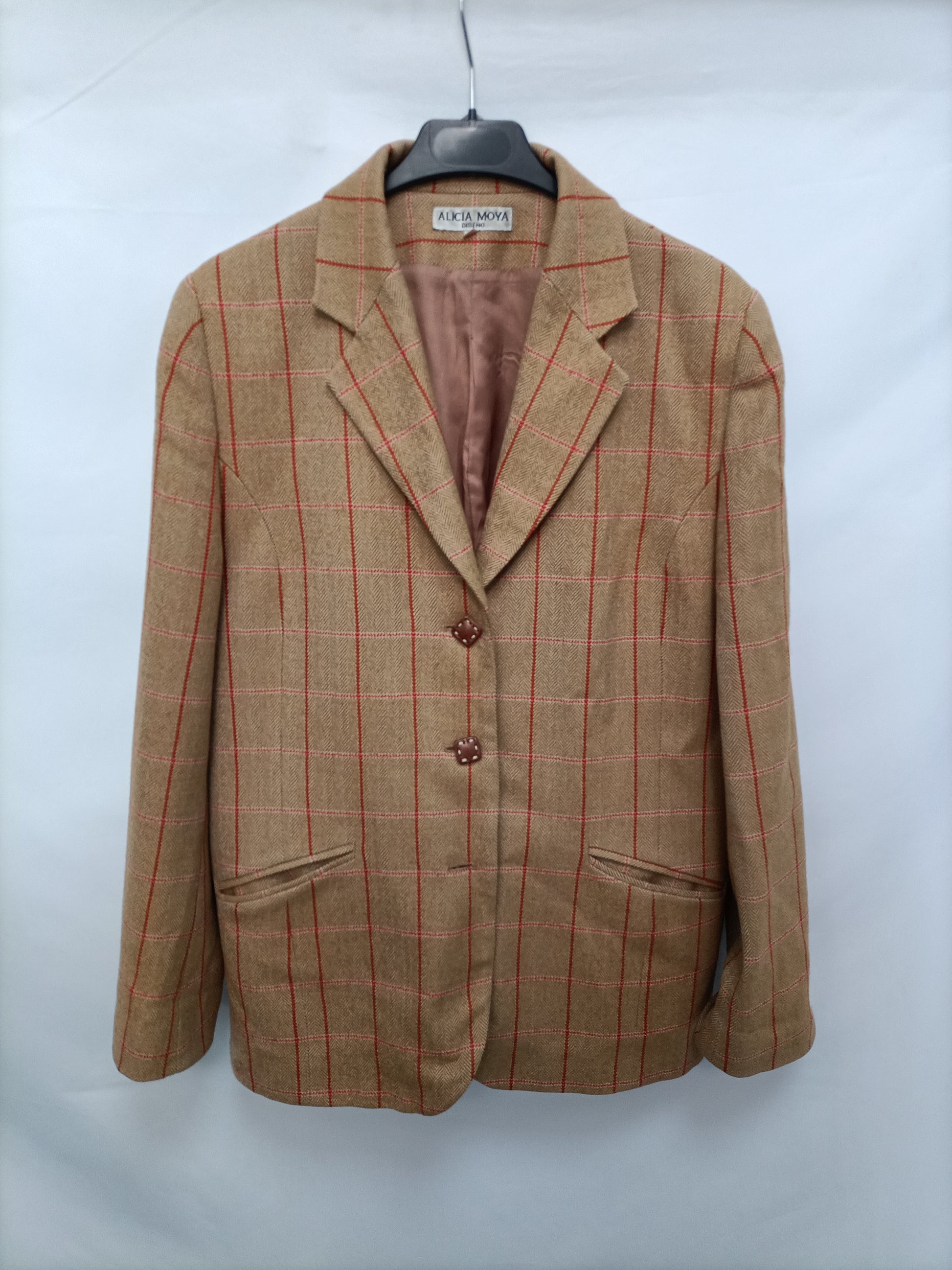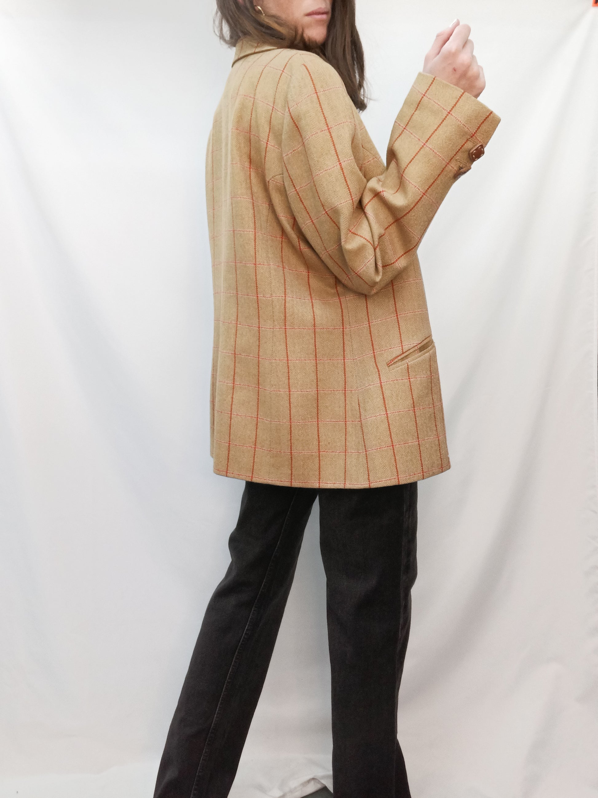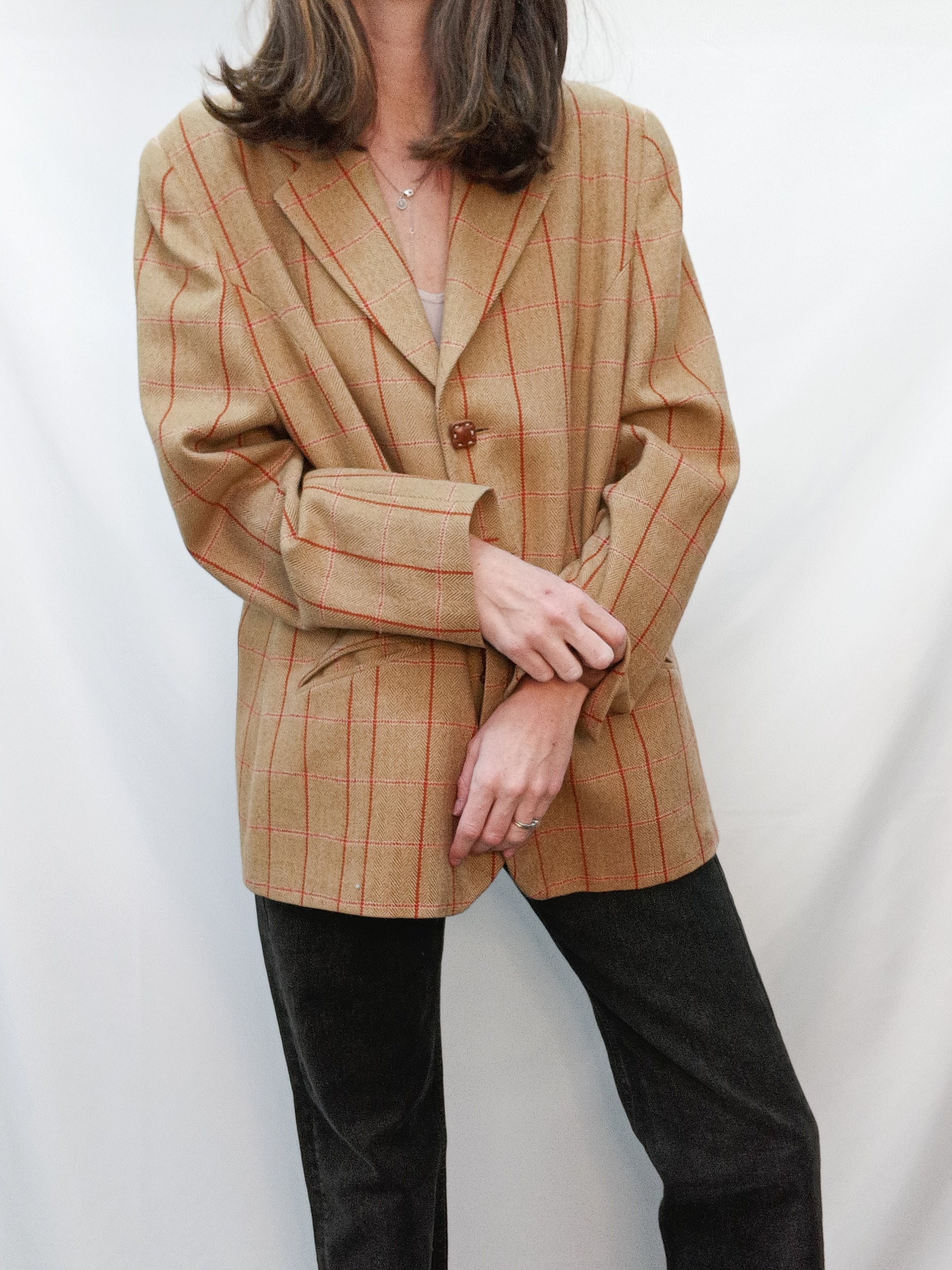 Camel jacket with red plaid and leather button detail. Oversized. 54 cm from armpit to armpit and 71 cm long.