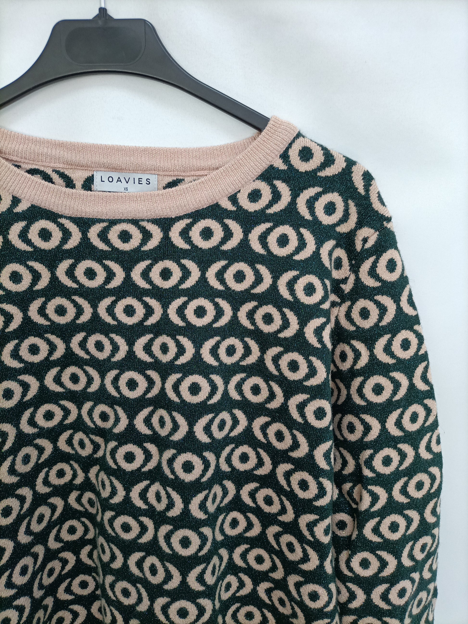 Green sweater with a pink print and metallic thread detail. Elastic. Length 58 cm. cm