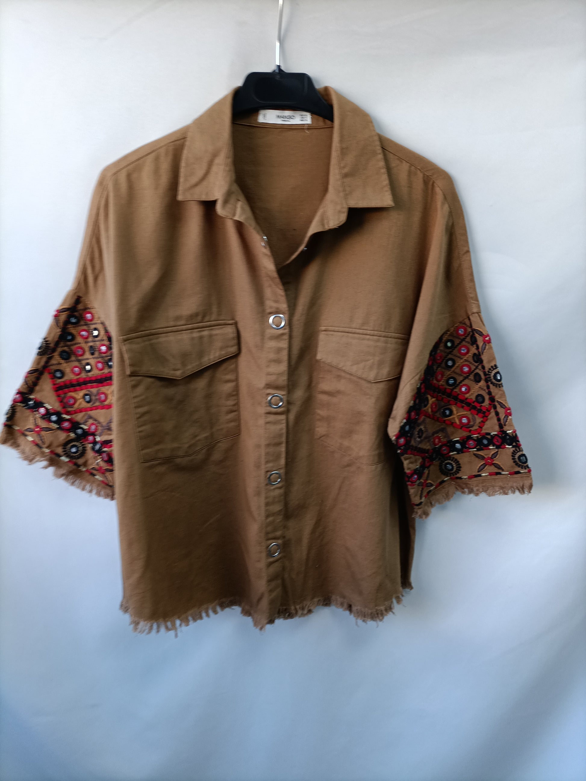 Camel cotton shirt with beaded sleeves. Non-stretch. Armhole to armhole 59 cm. Length 62 cm.
