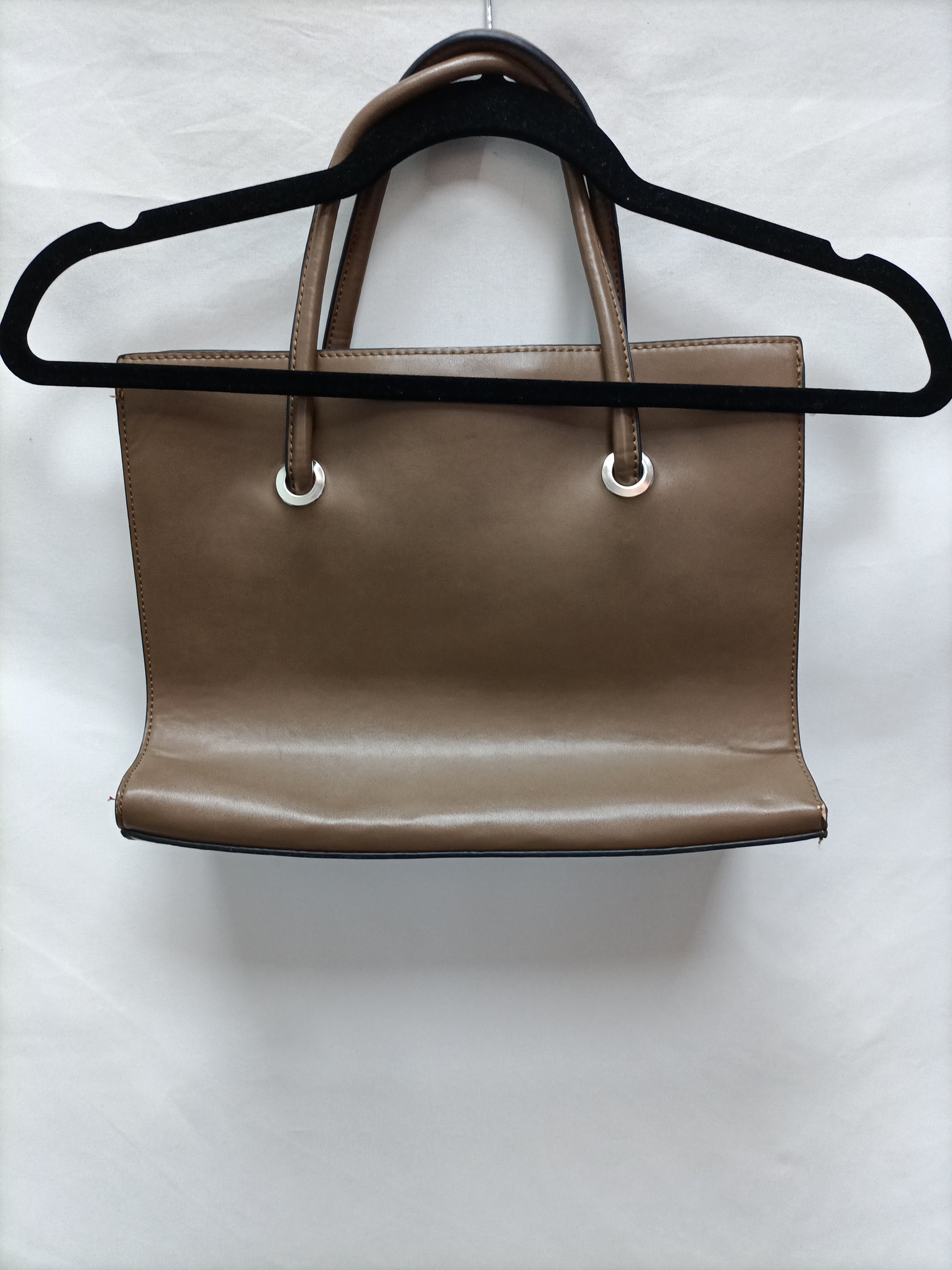 Bolso marrón estilo cartera de asa corta con varios compartimentos. Efecto piel. 30x26x18 cm