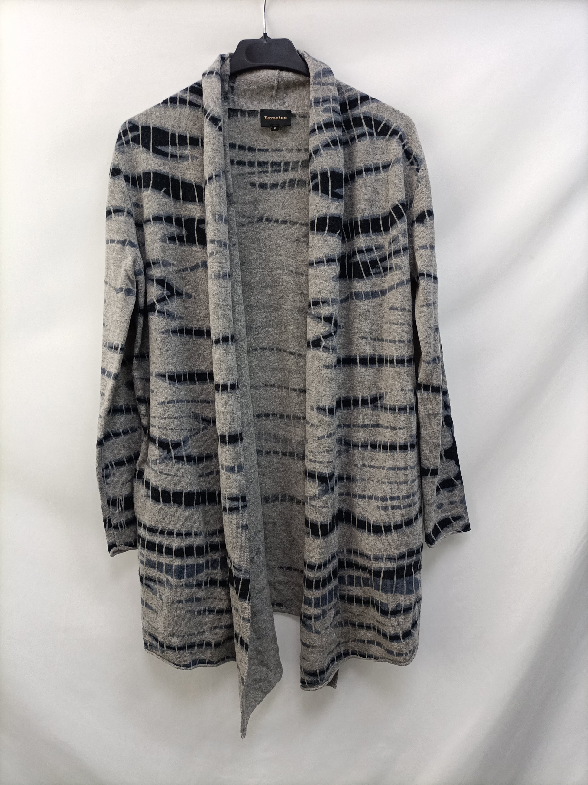 Gray cardigan with blue print. 90% wool, 10% cashmere. 76 cm long.