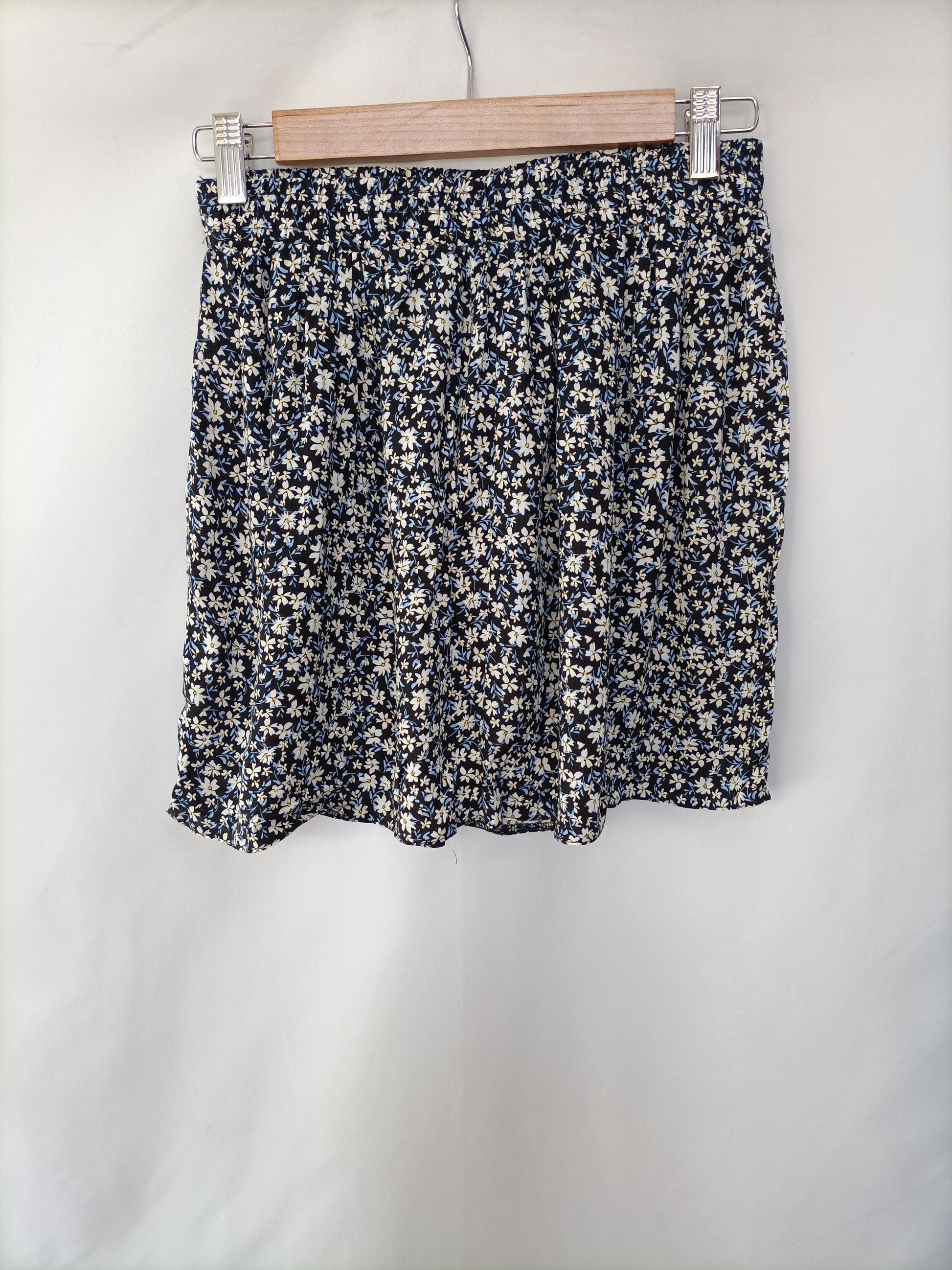 NEW WITH TAG. Short black floral skirt. Button detail at front. Elastic waist. 40 cm long.