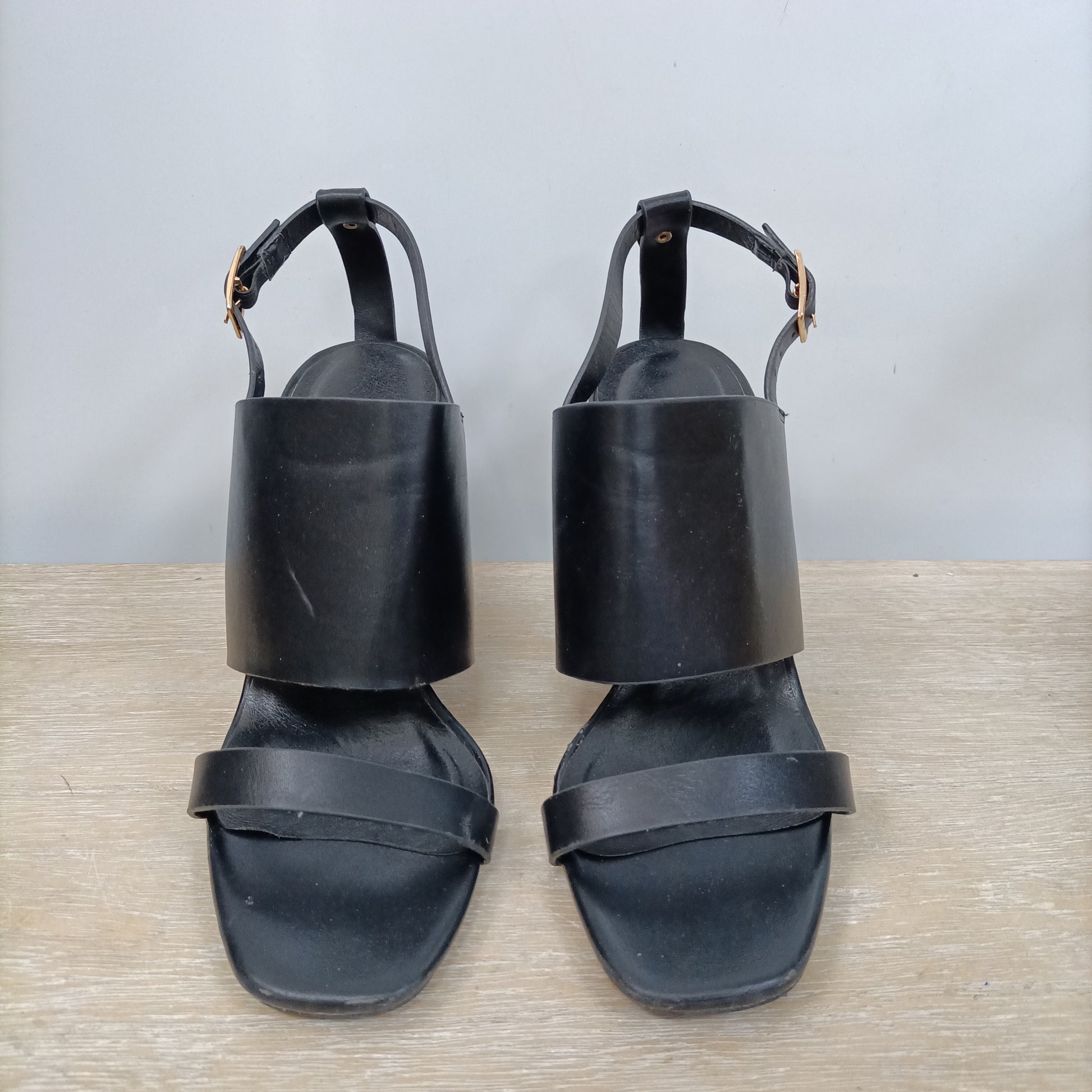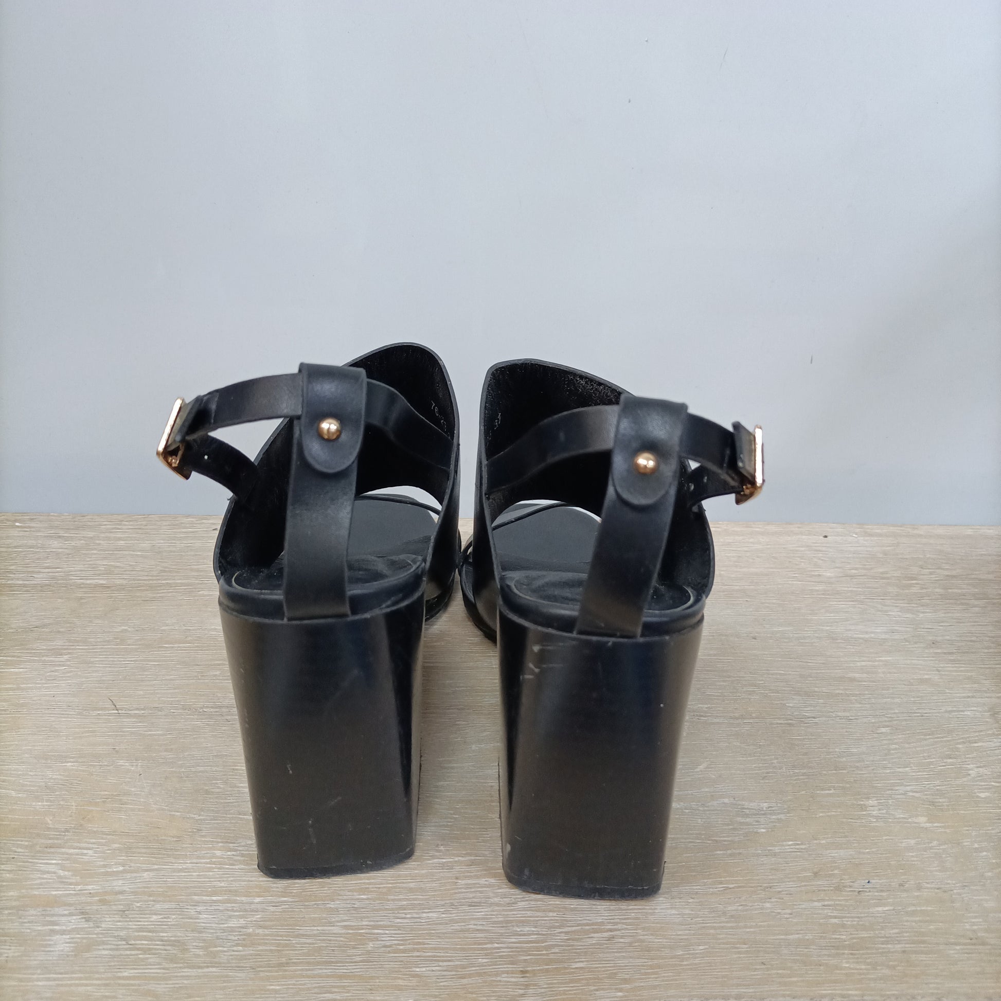 Black square-heeled sandals. 9 cm heel. Tare: some scratches.