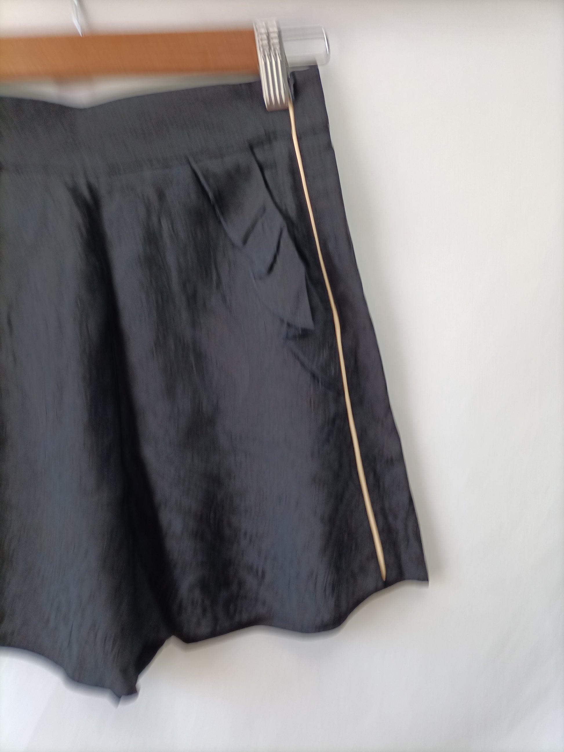 Flowy black sgorts with gold stripe detailing and ruffled pockets. Non-elastic. Waist 32 cm, Length 39 cm.
