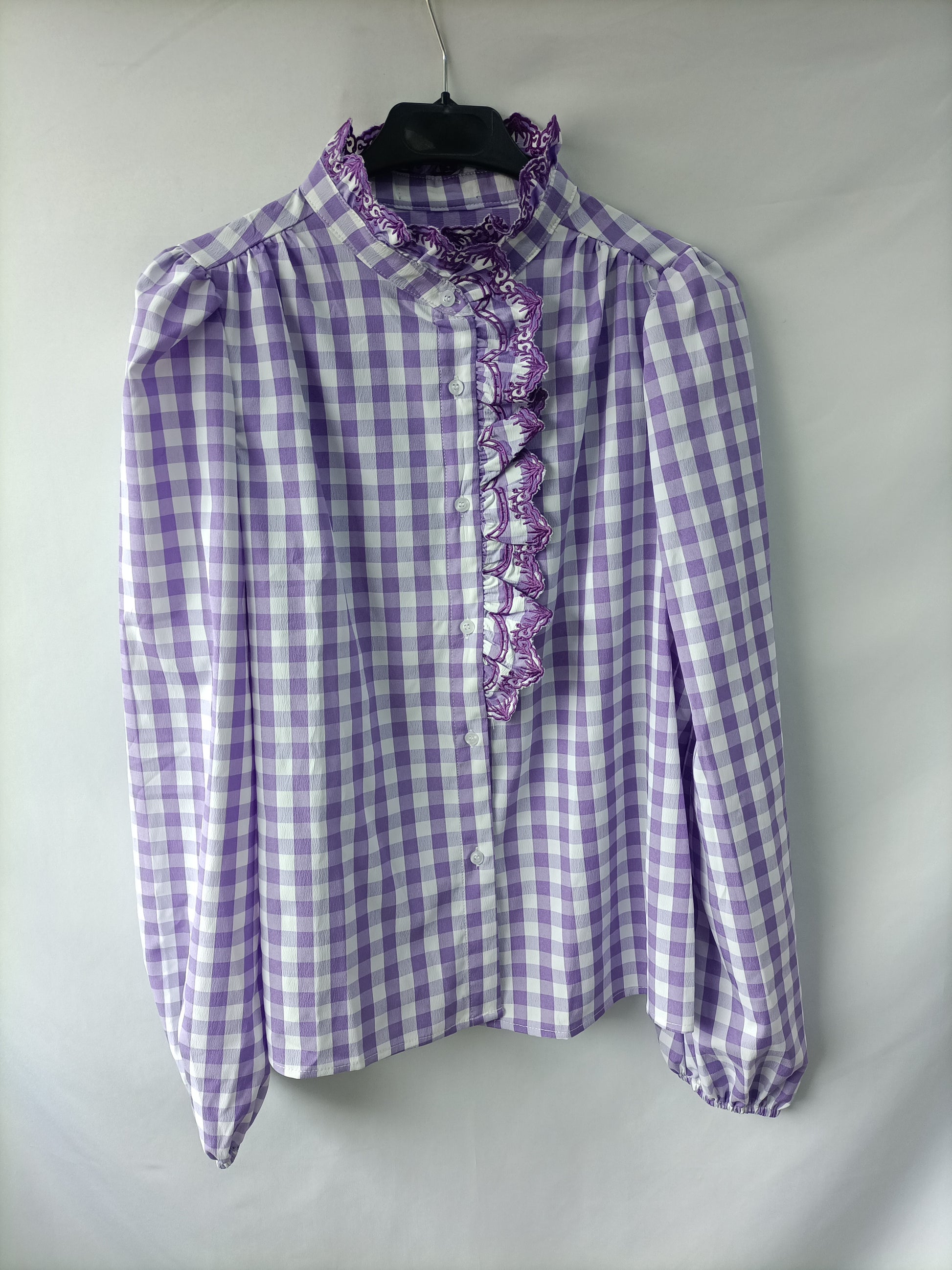 White and purple gingham button-down blouse with embroidered ruffle detail at the neckline. 48 cm from armhole to armhole. 60 cm long.