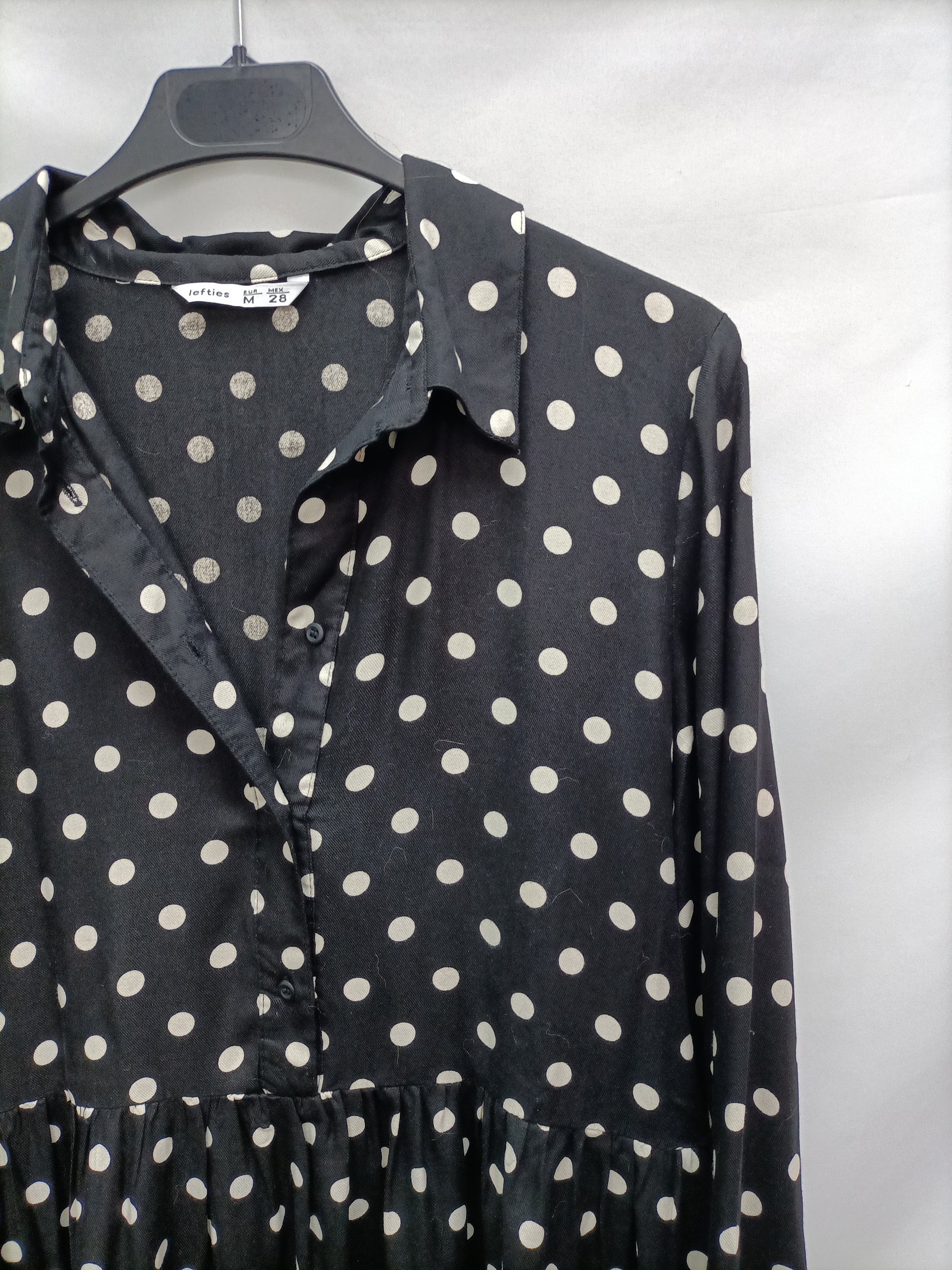Flowy black polka dot shirt dress. Non-stretch. 49 cm from armhole to armhole and 90 cm long.
