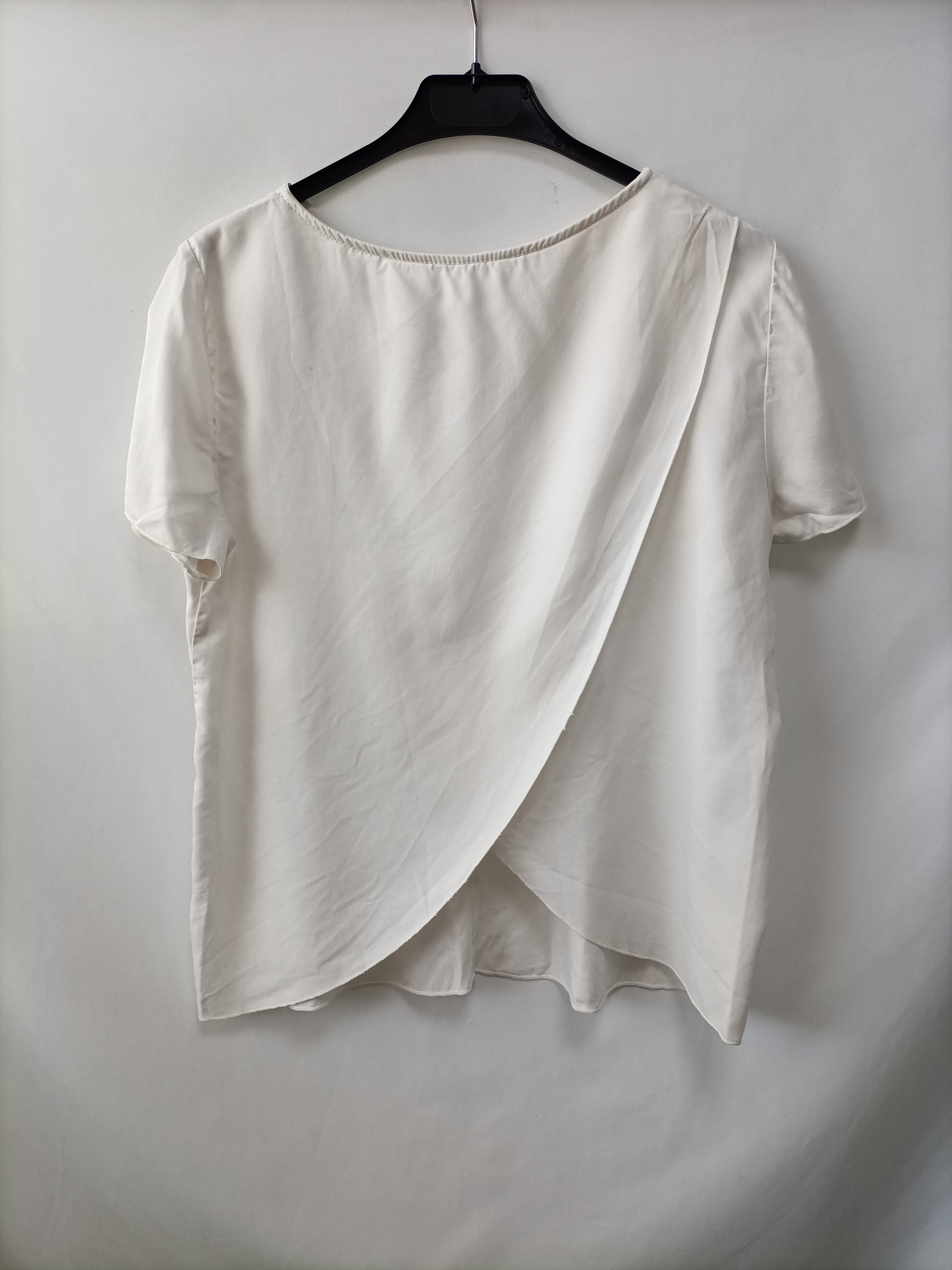 Flowy beige top with an open, crossed back. 50 cm from armpit to armpit. 53 cm long.
