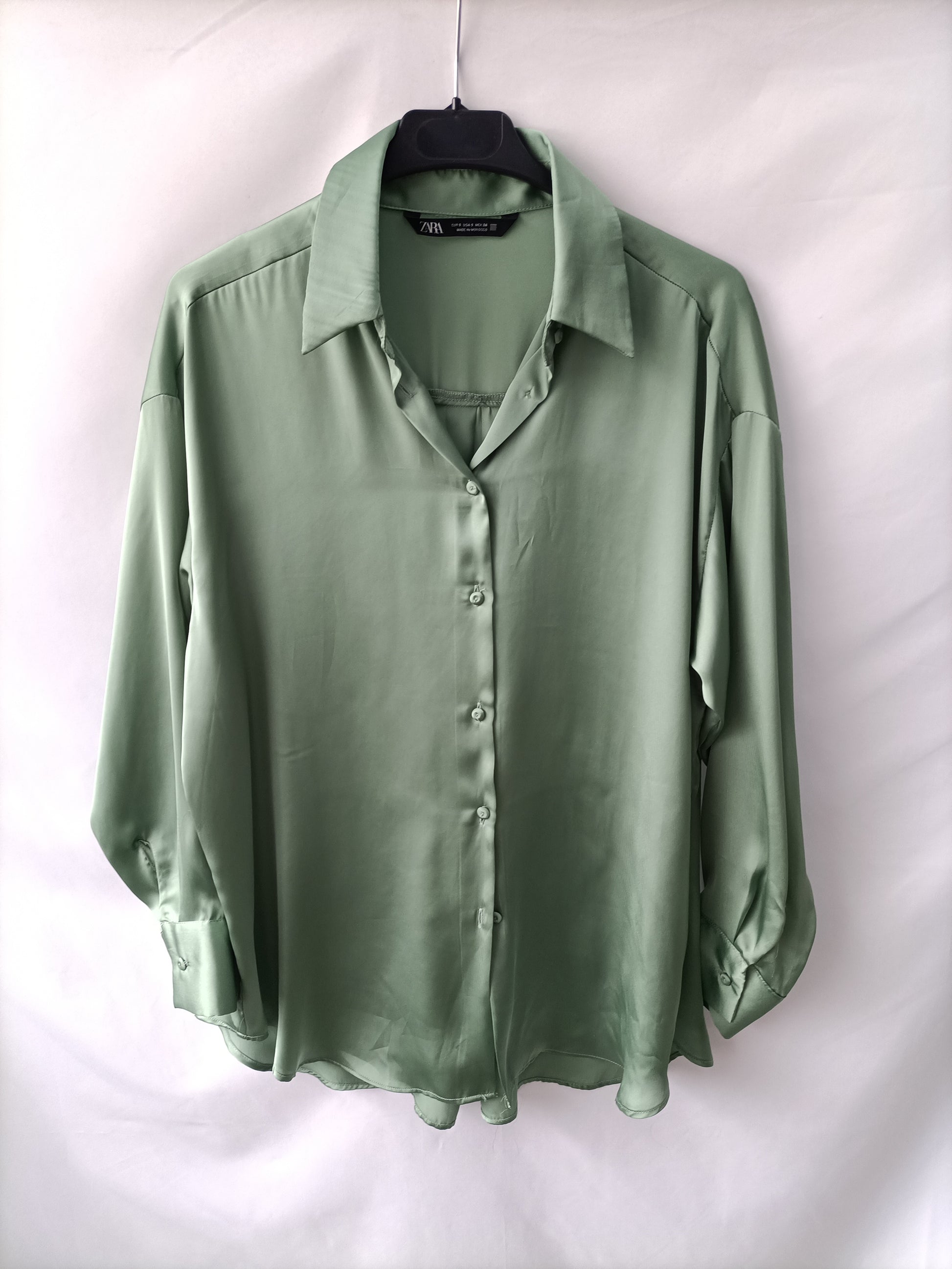 Flowy green satin blouse. Buttoned. No stretch. 60 cm from armhole to armhole, 78 cm long.
