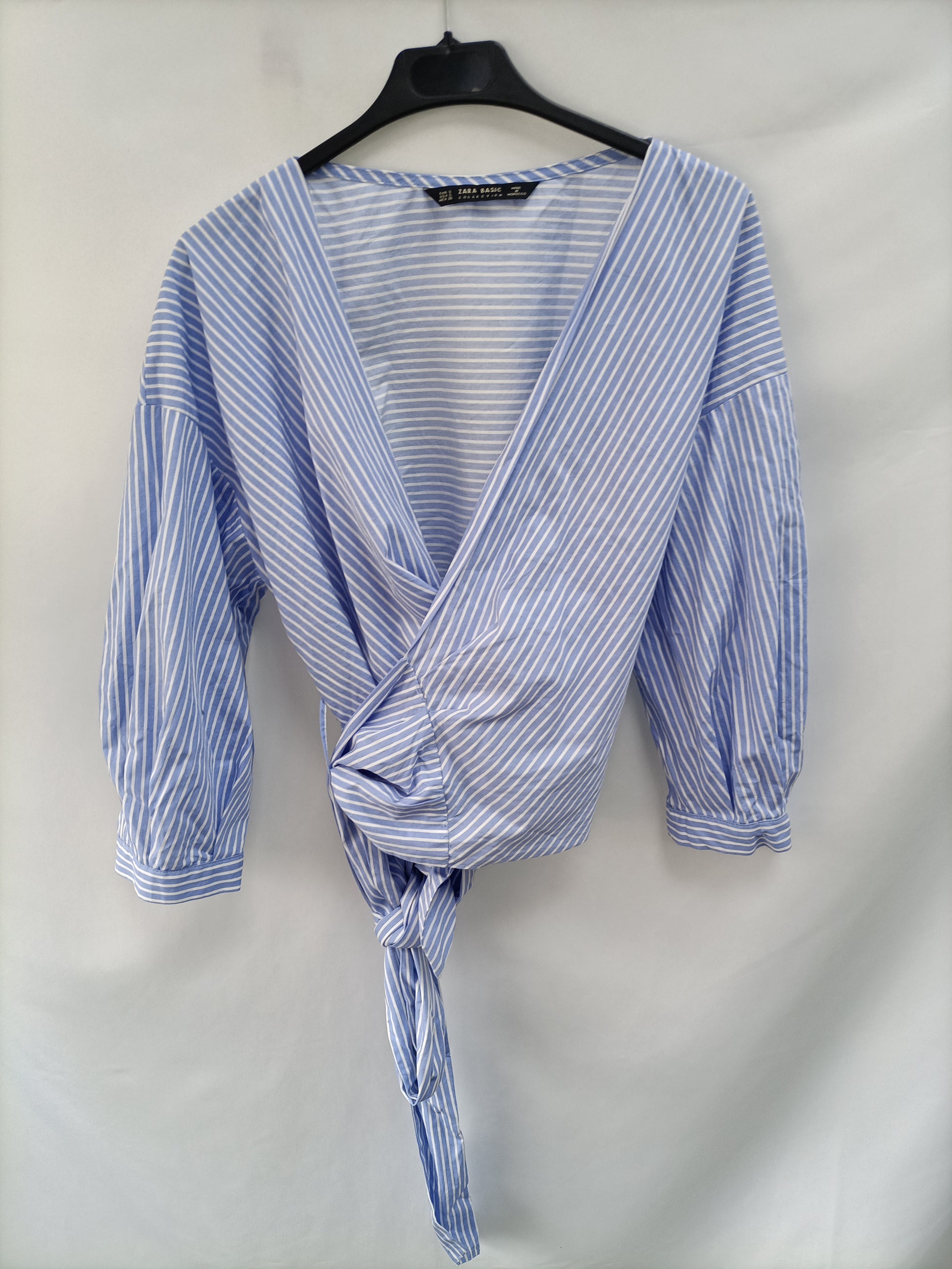 Blue and white striped wrap blouse with slightly puffed sleeves. 53 cm from armhole to armhole and 47 cm long.