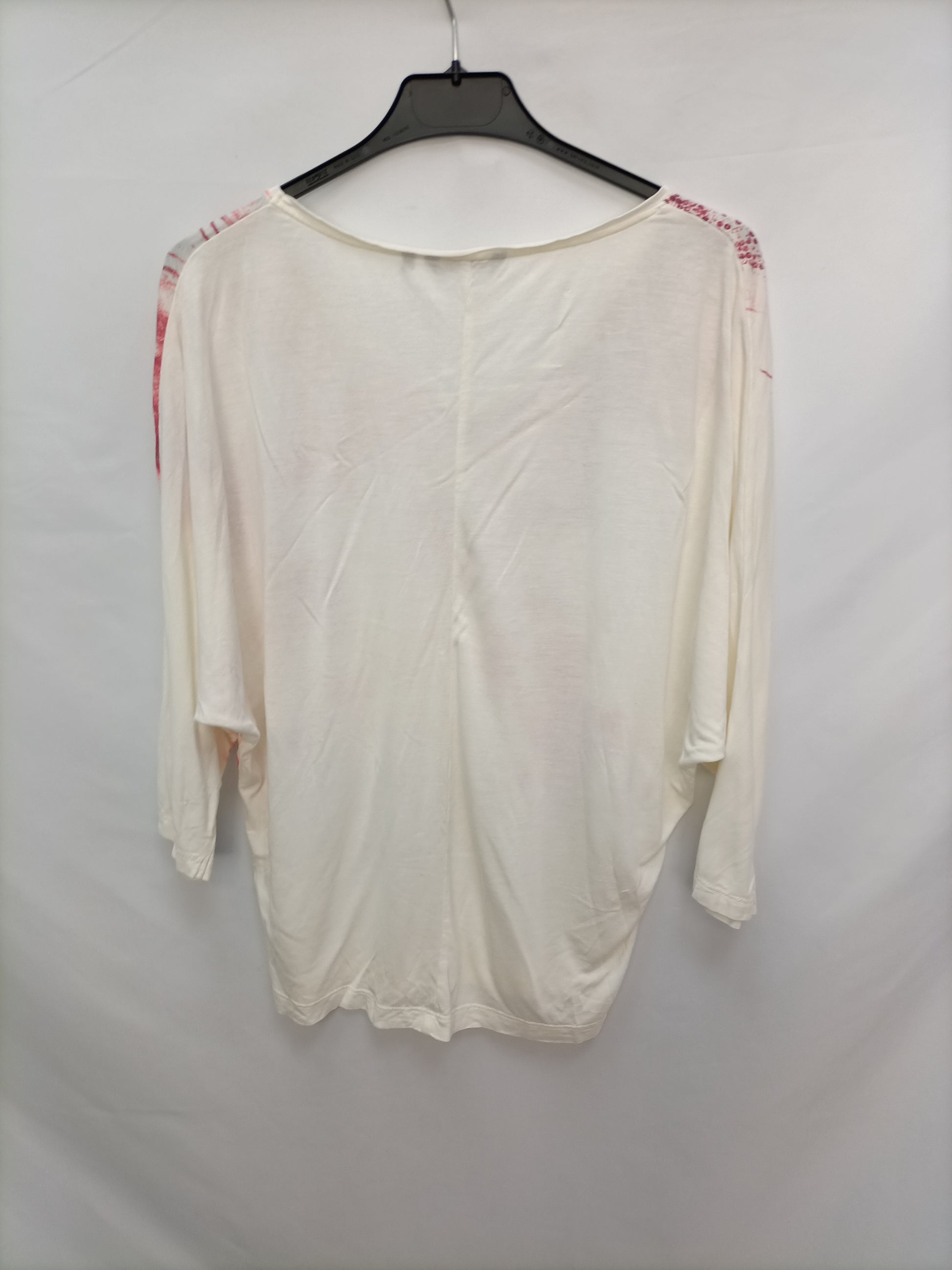 Flowy off-white T-shirt with a waxed tie-dye print and silver details. 62 cm long.