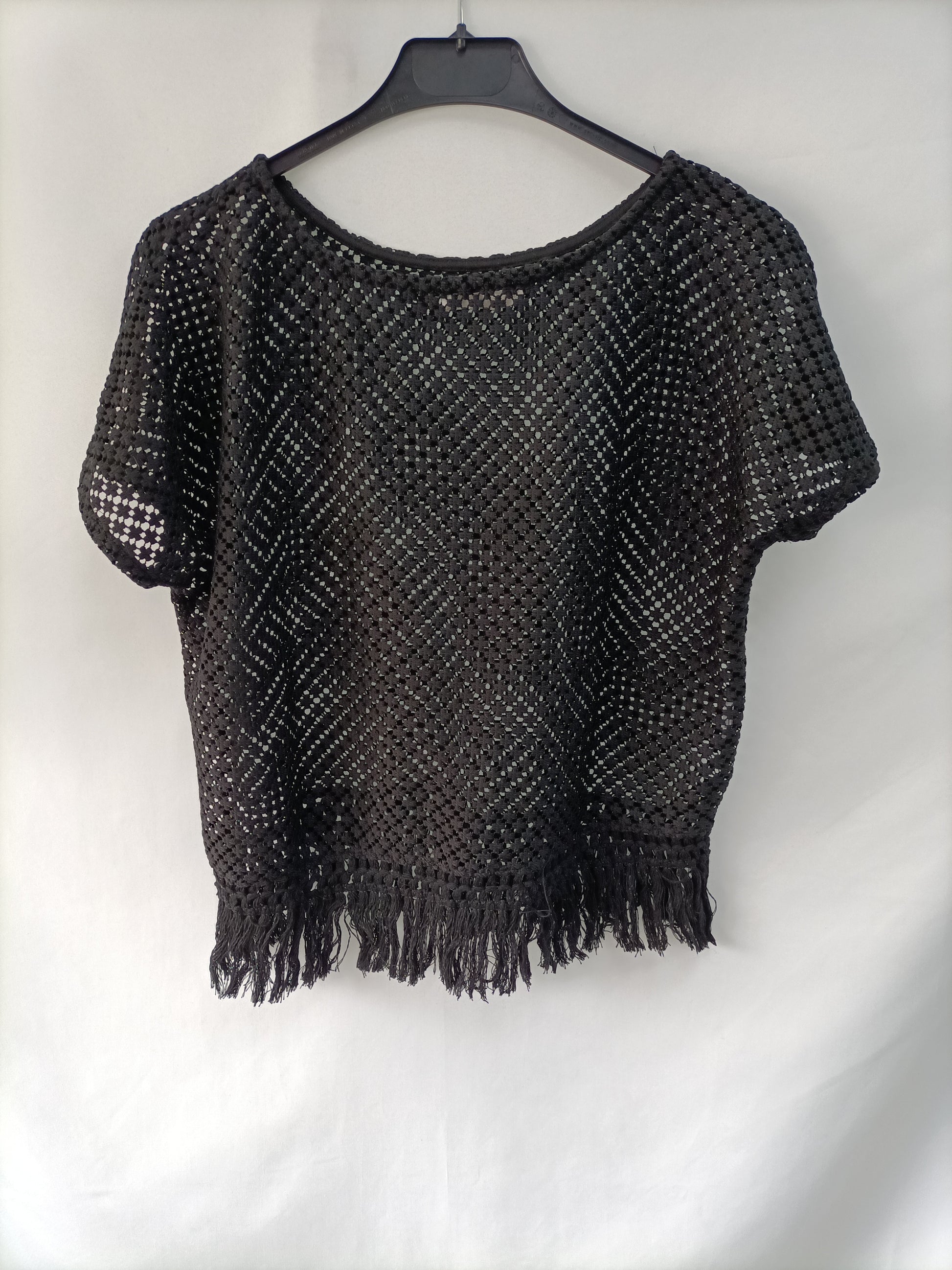 Black open knit top with flowing, stretchy fringes. 47 cm long.