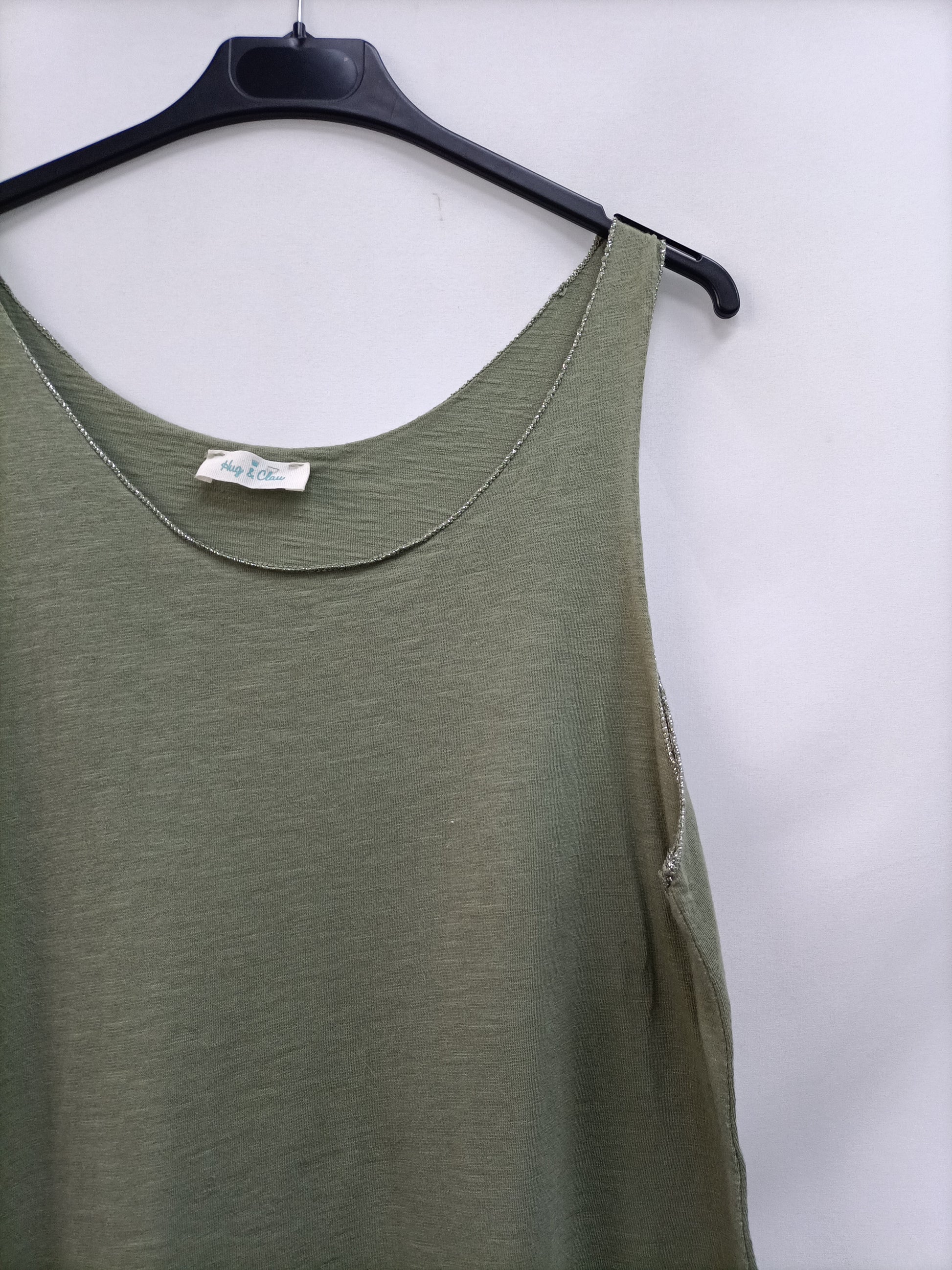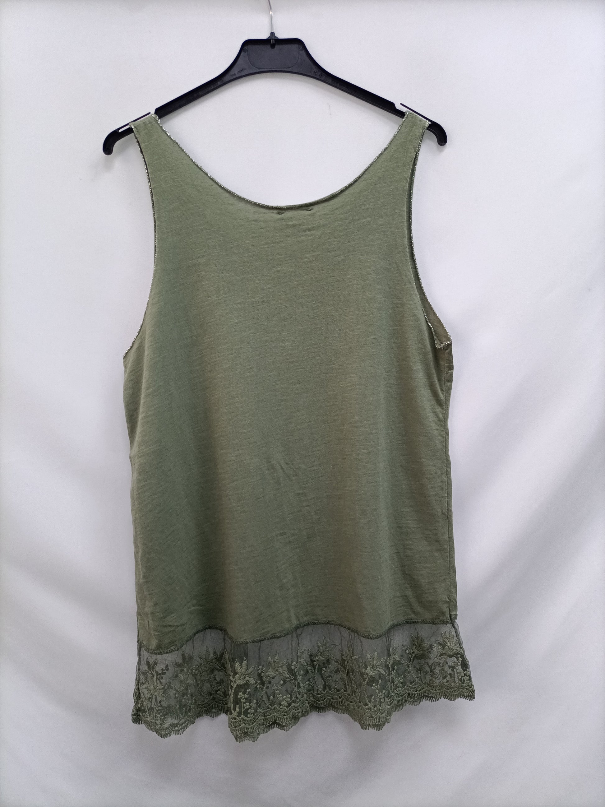 Green top with lace detail and silver threads. Length 73 cm.