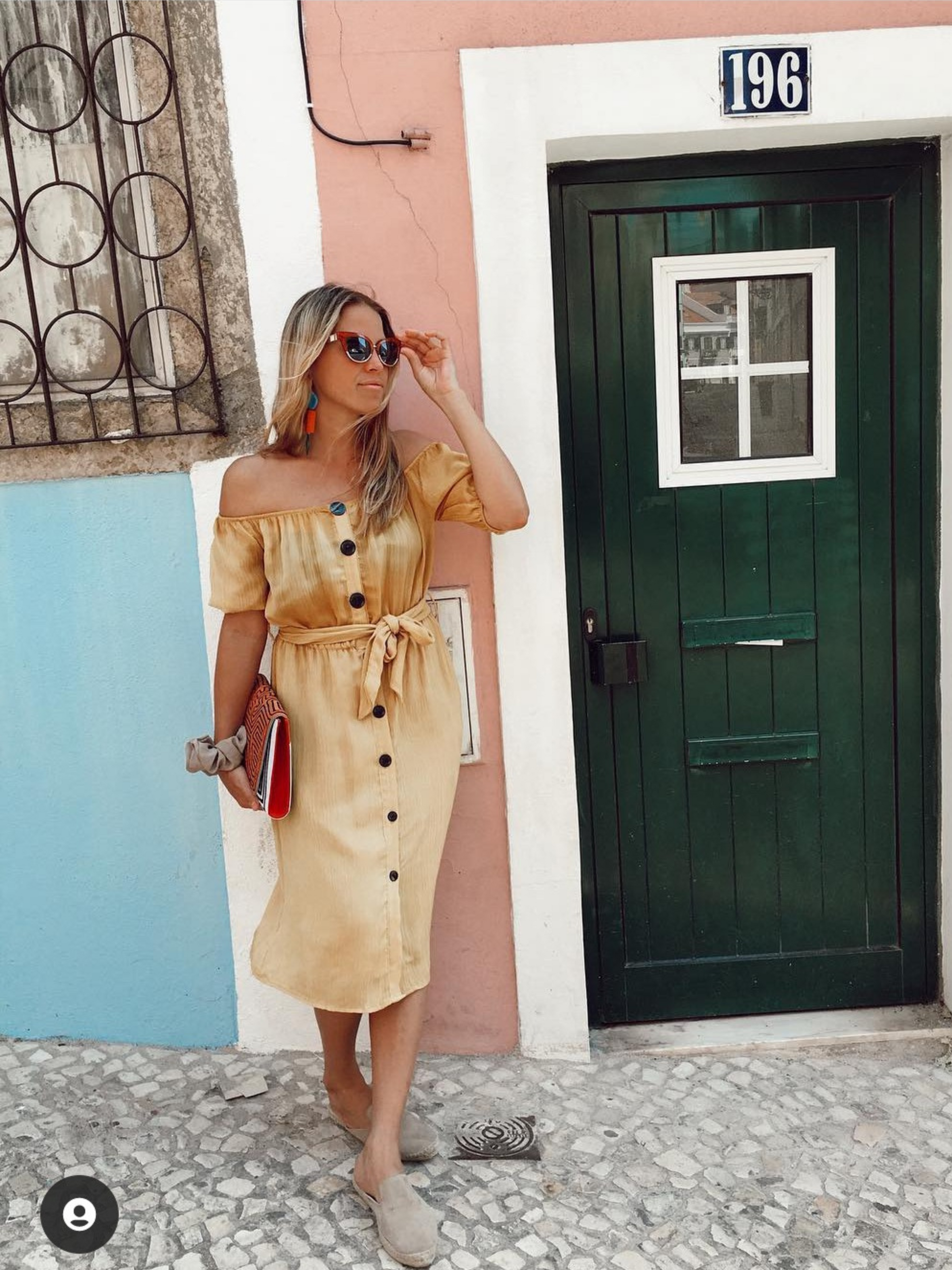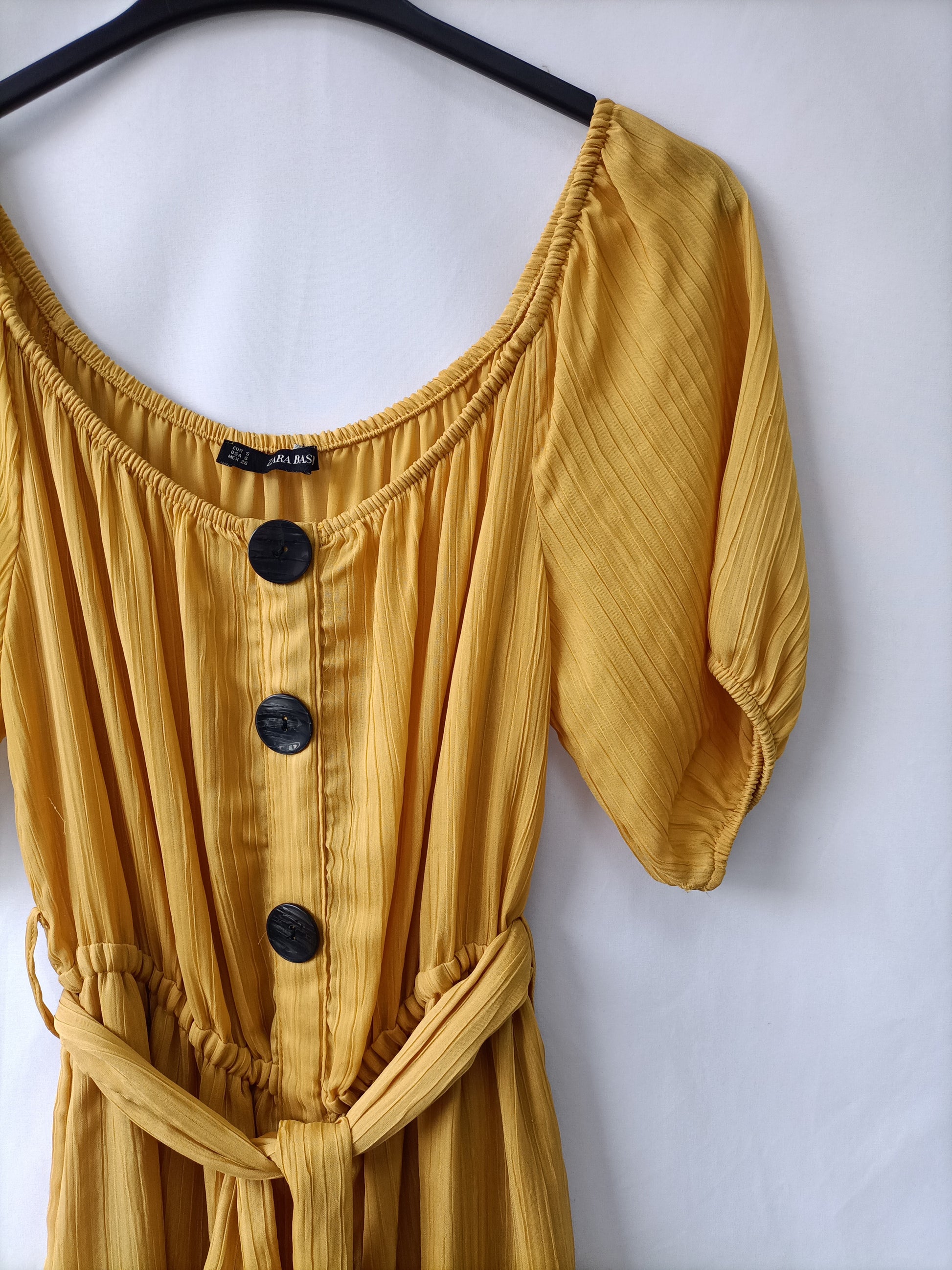Mustard pleated buttoned midi dress with a boat neckline and slightly puffed sleeves. Flowy. Armhole to armhole 47 cm, length 95 cm.