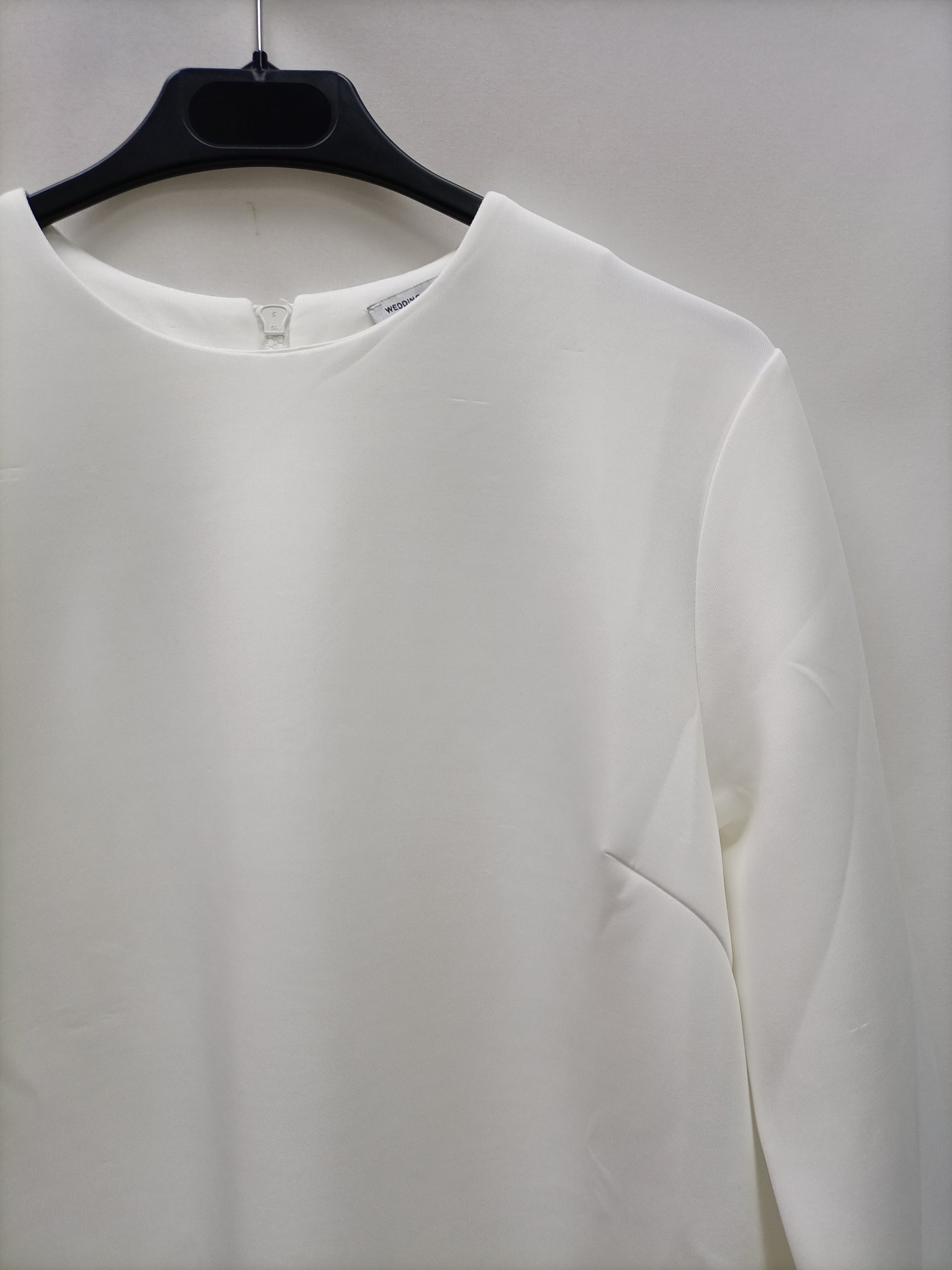 White dress with neoprene fabric. Stretchy. Length 81 cm.