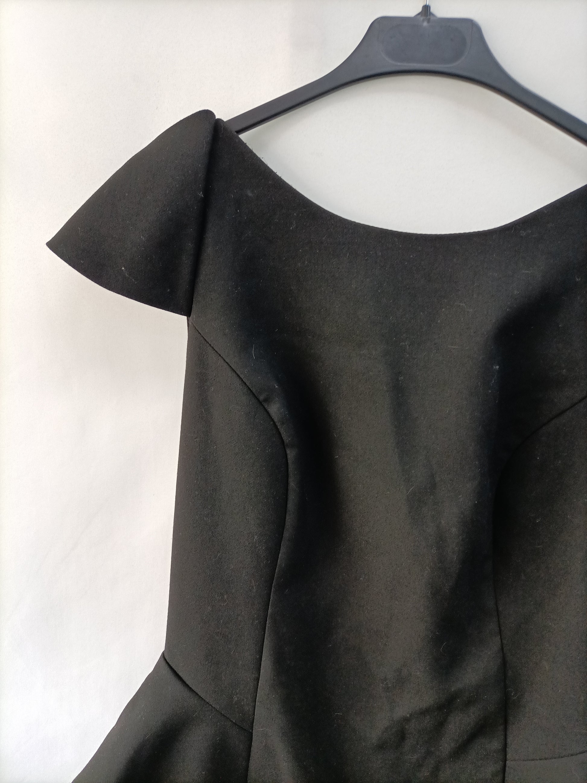 Vestido corto negro ajustado con volante en los laterales. Espalda al aire. No elástico. De sisa a sisa 46 cm largo 78 cm