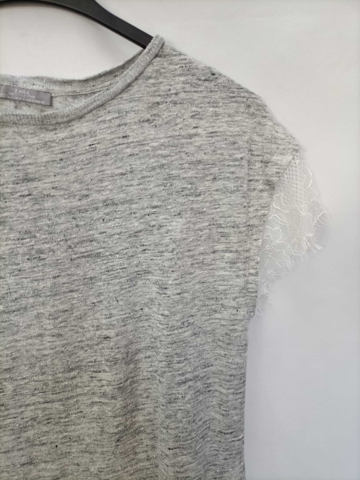 Zara. S. Heathered gray T-shirt with white lace detailing on the sleeves and bottom. Stretchy. Length 62 cm.