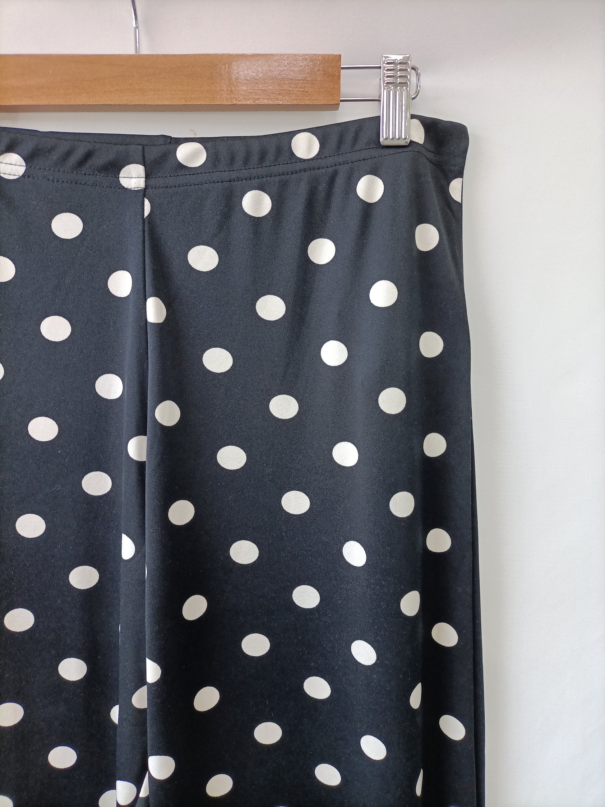 Black bell-bottom trousers with white polka dots. Stretchy, flared, lycra-like fabric. 111 cm long.