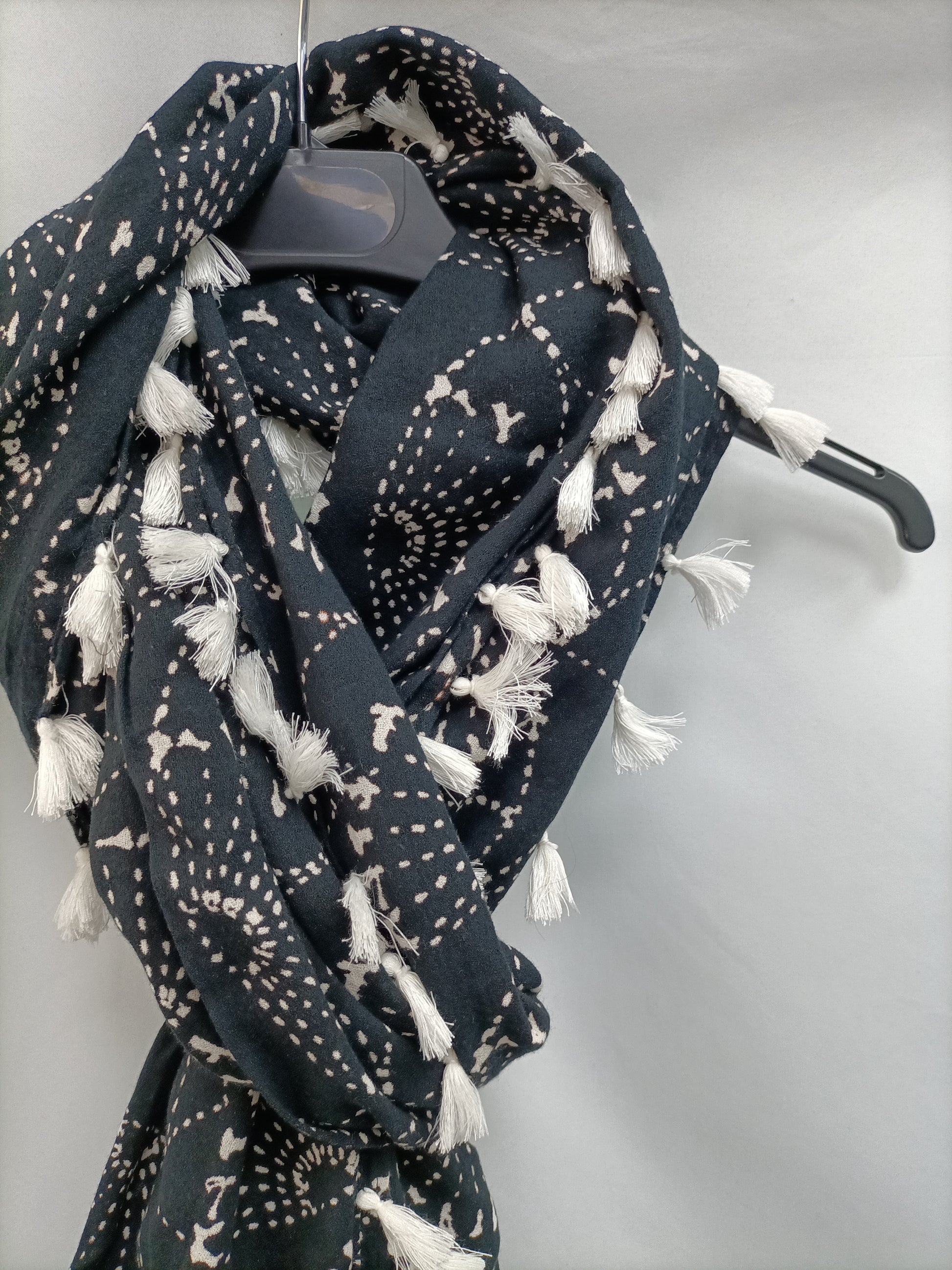 NEW WITH TAG. Black pashmina with white print and fringes.