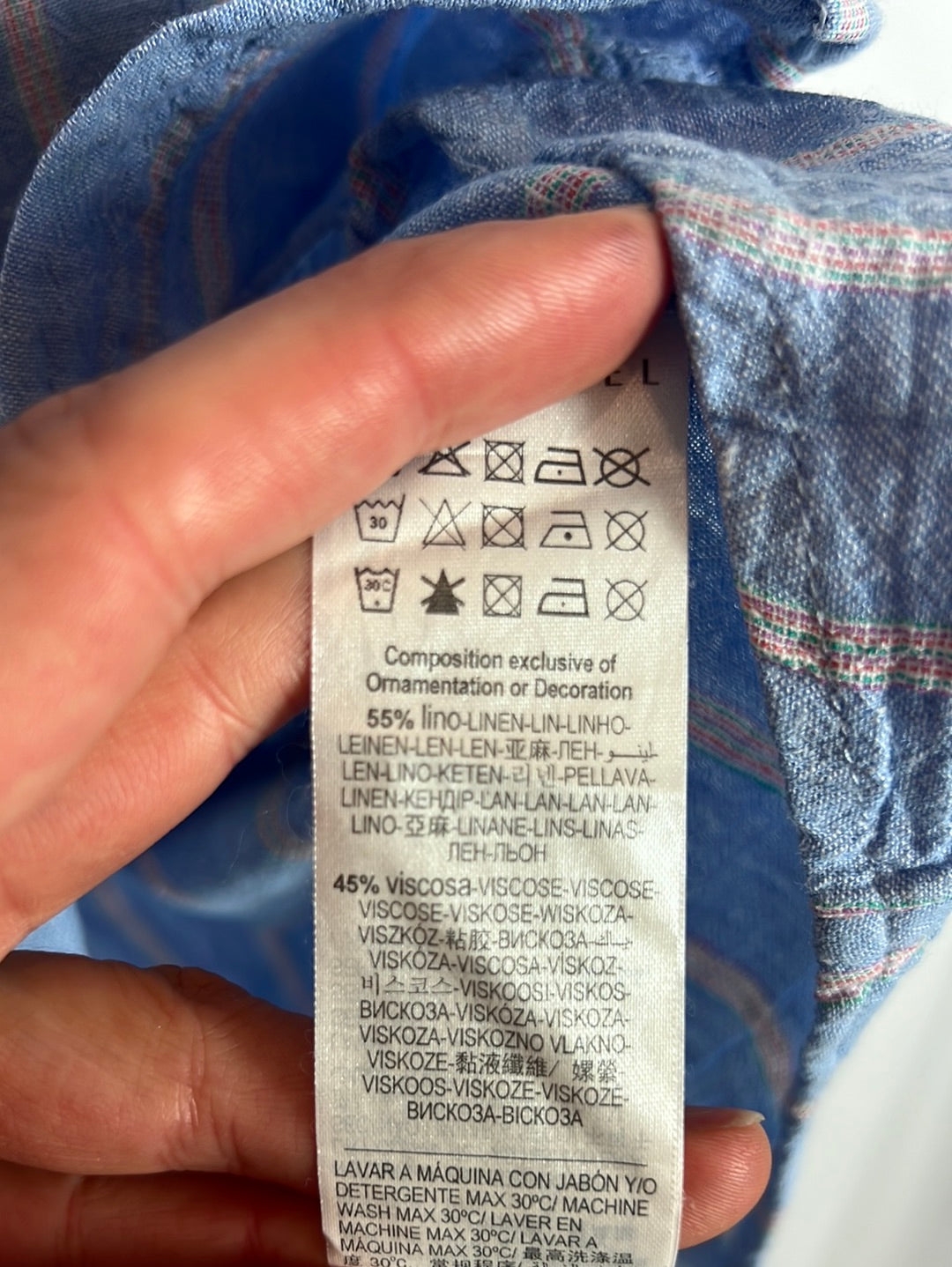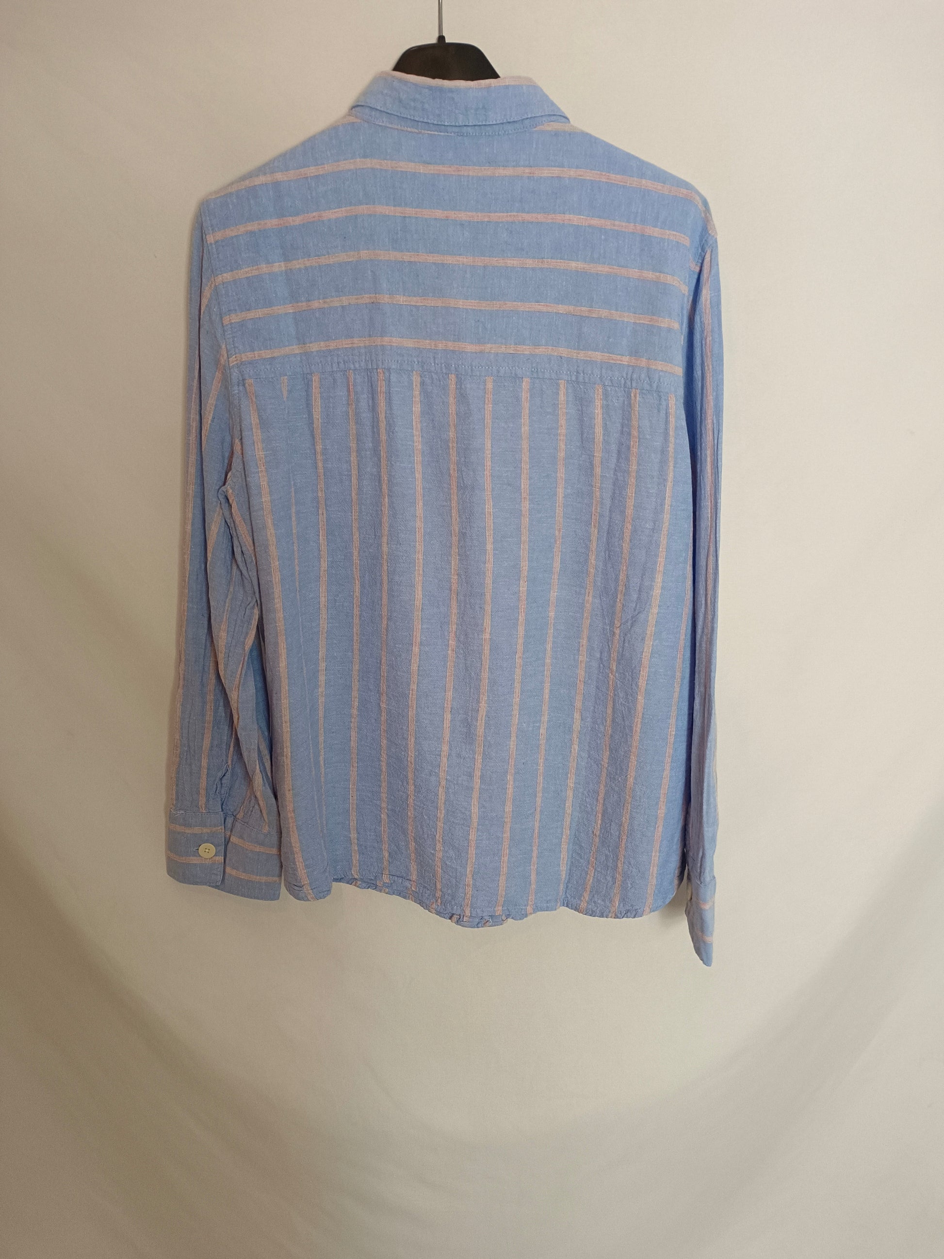 Blue linen and viscose shirt with red stripes. Linen and viscose. Shoulders 39cm, length 64cm
