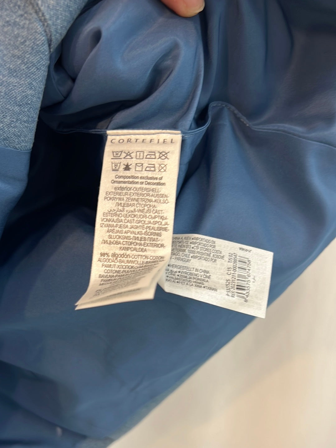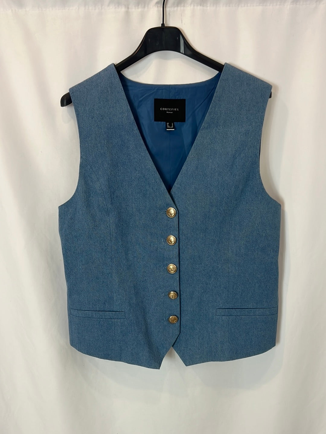 Buttoned denim vest. 18" (46cm) armhole to armhole, 20" (51cm) long.